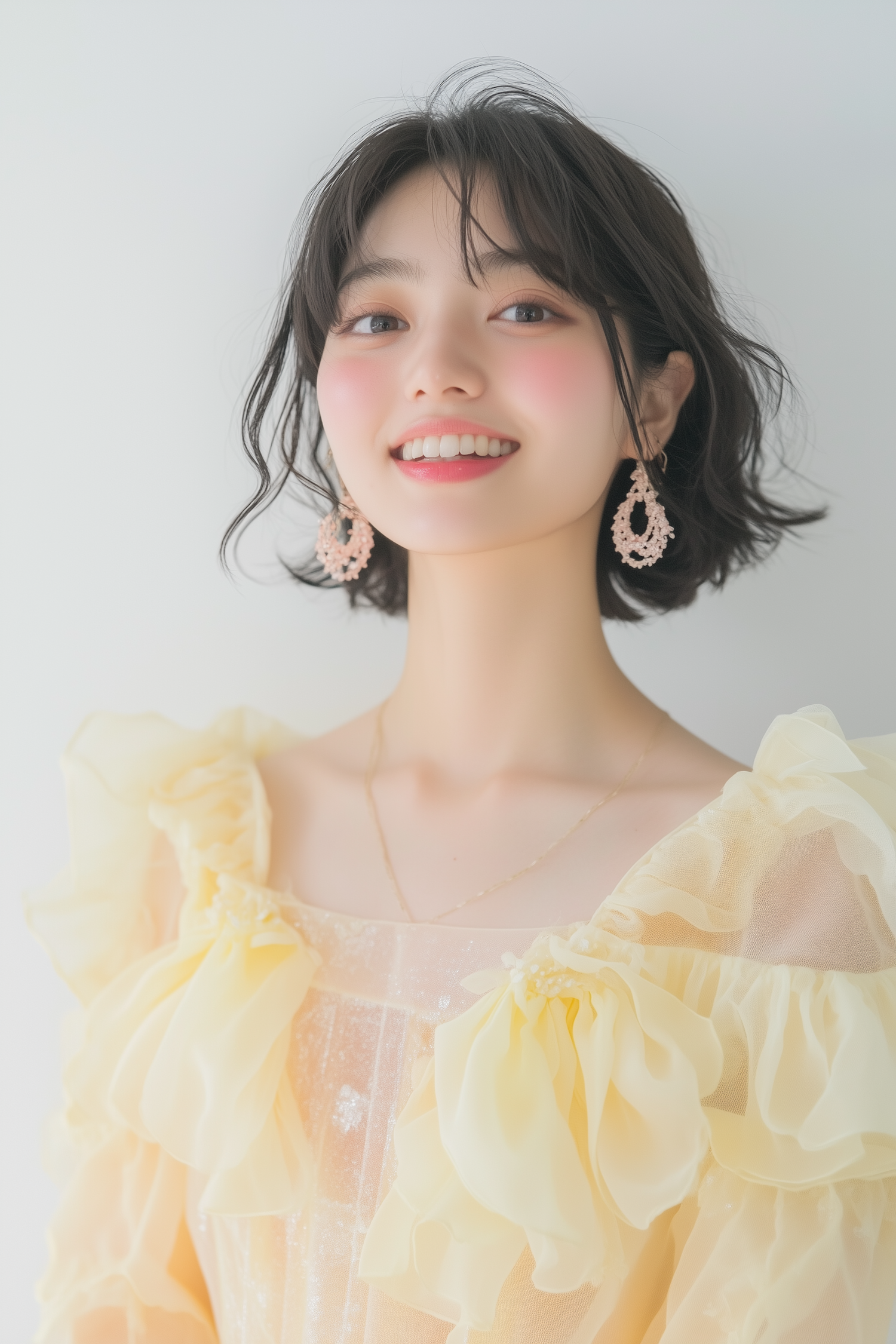 Smiling woman in a ruffled yellow dress with short black hair, pink blush, and lace-like earrings, radiating a cheerful and elegant vibe.