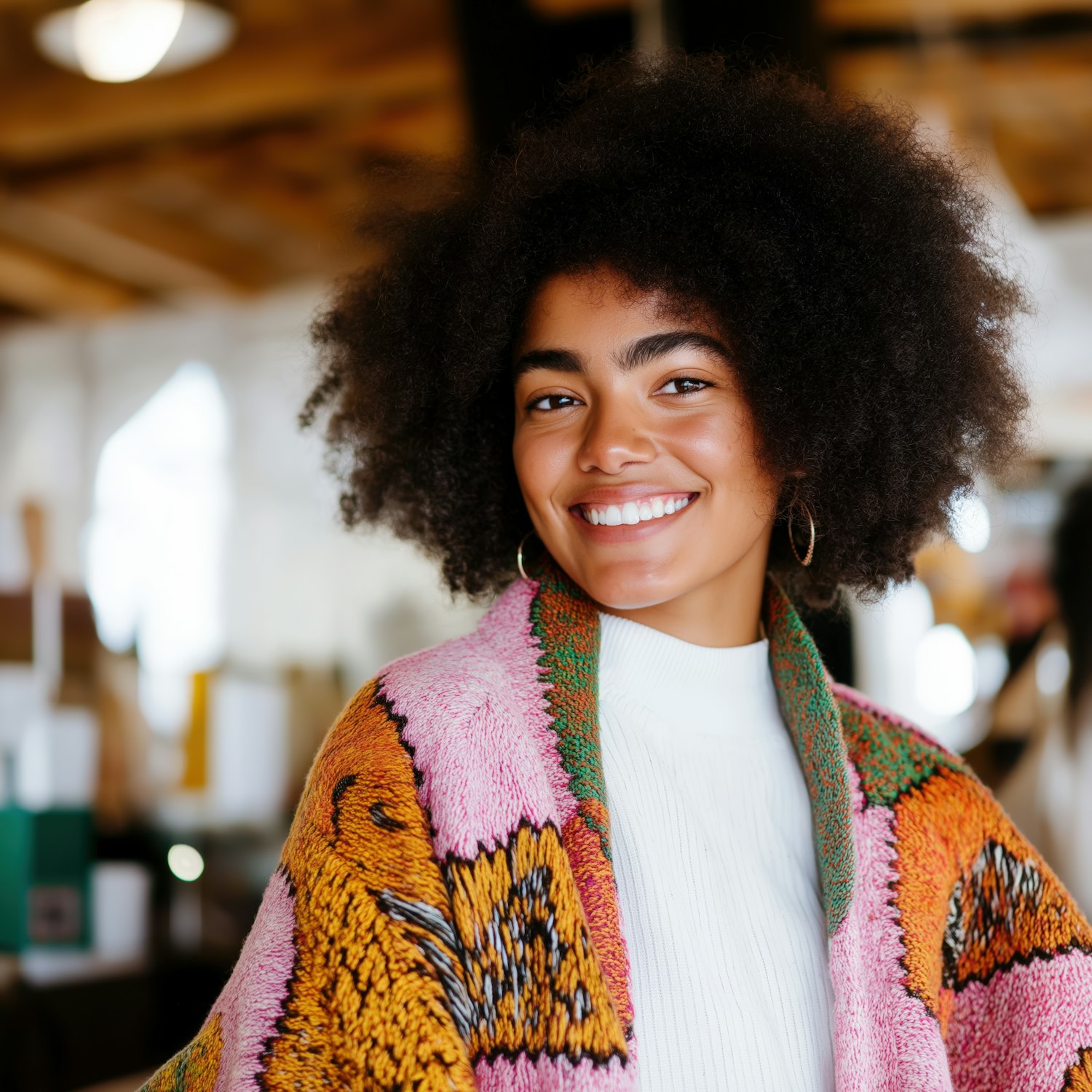 Smiling woman with natural afro hair, wearing a colorful shawl and gold hoops, in a cozy, warmly lit indoor setting.