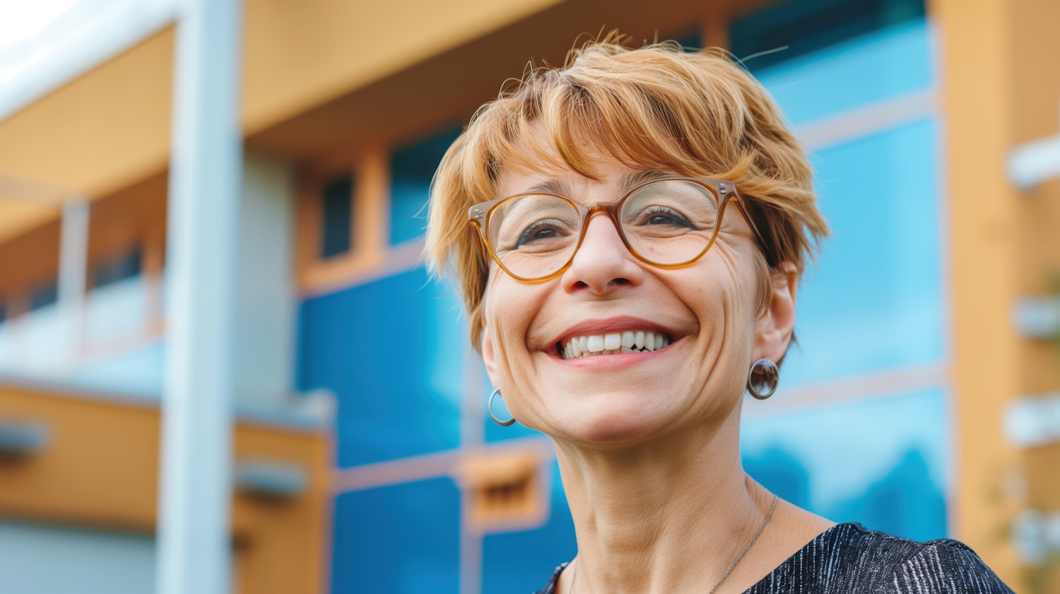 Smiling woman with short light brown hair, glasses, and hoop earrings in front of a modern blue and yellow building.