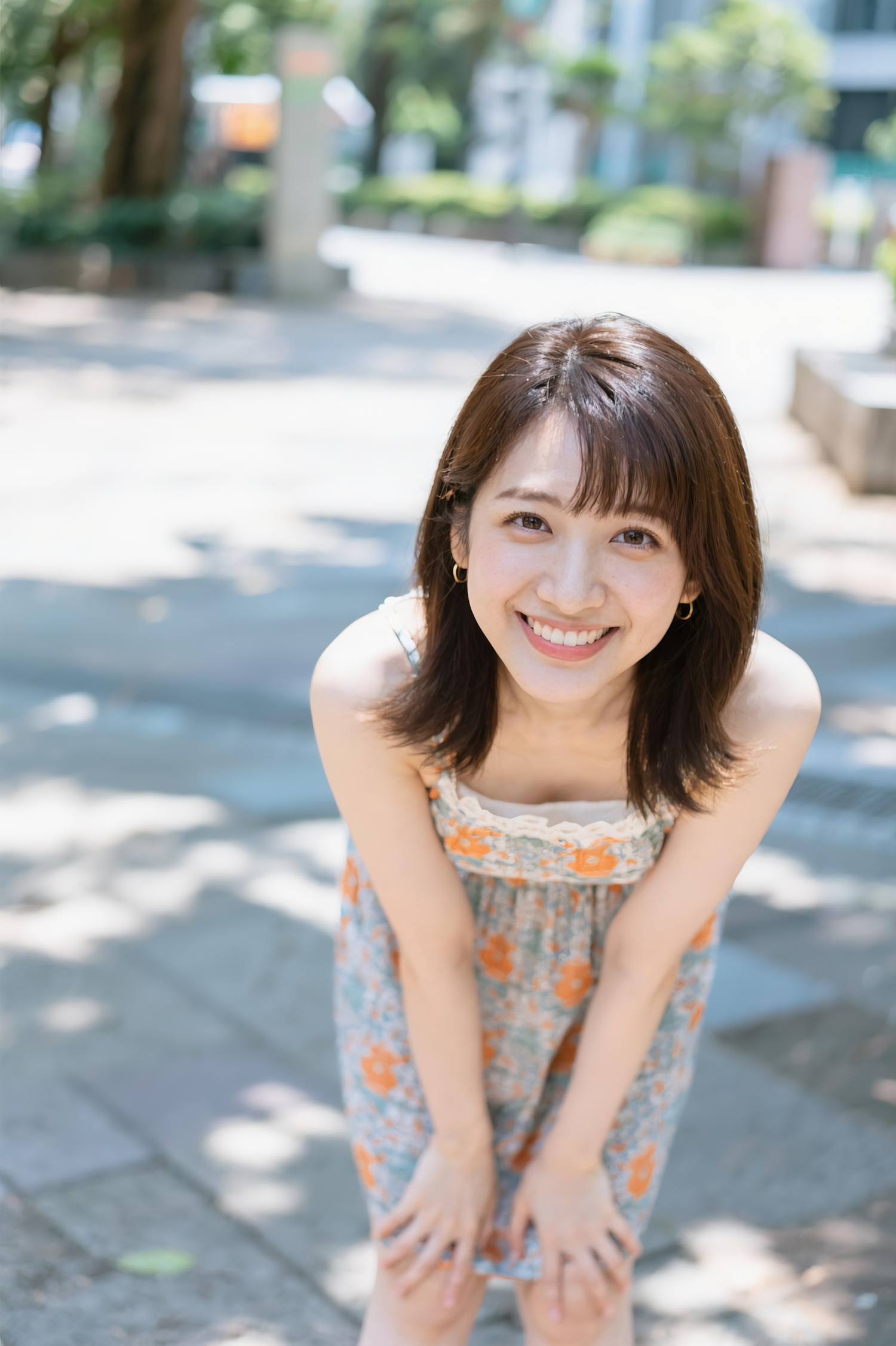 Smiling woman in a floral dress outdoors on a sunny day, radiating warmth and positivity in a natural park setting.