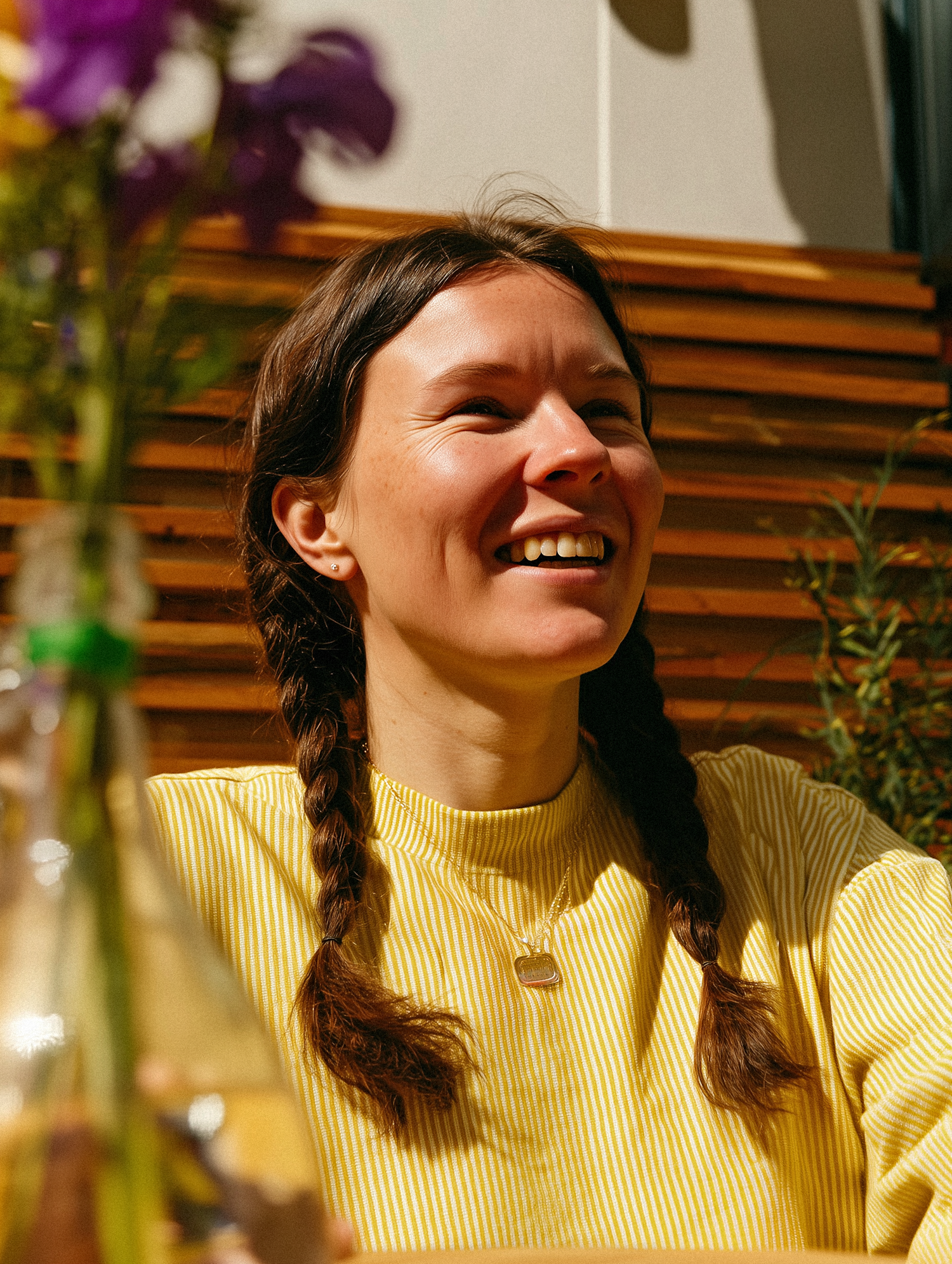 A cheerful woman with braided hair and a yellow top enjoys a sunny day outdoors, with flowers and wooden decor in the background.