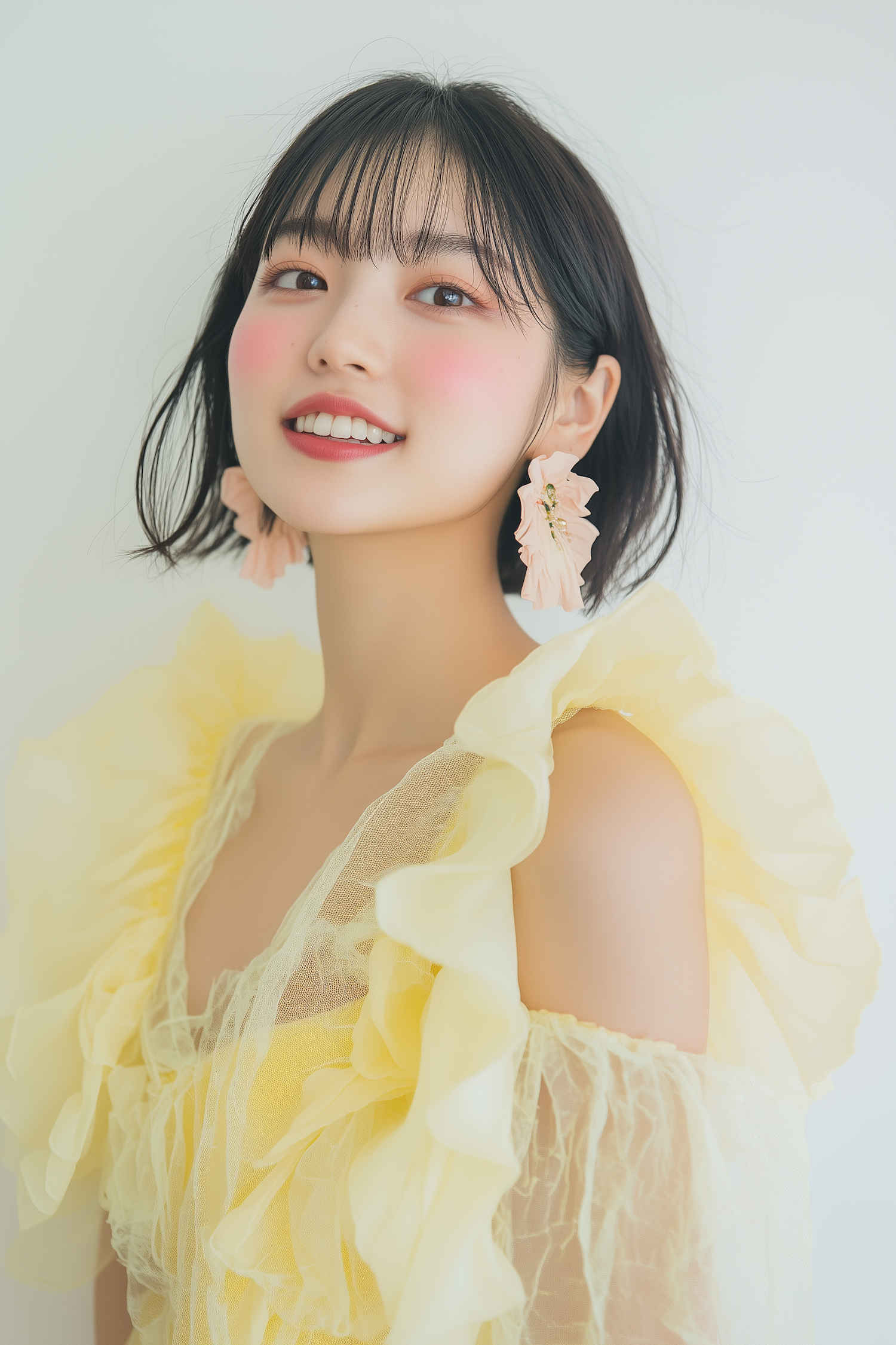 A cheerful woman in a ruffled yellow dress and pink floral earrings, radiating charm with her warm smile and soft makeup.
