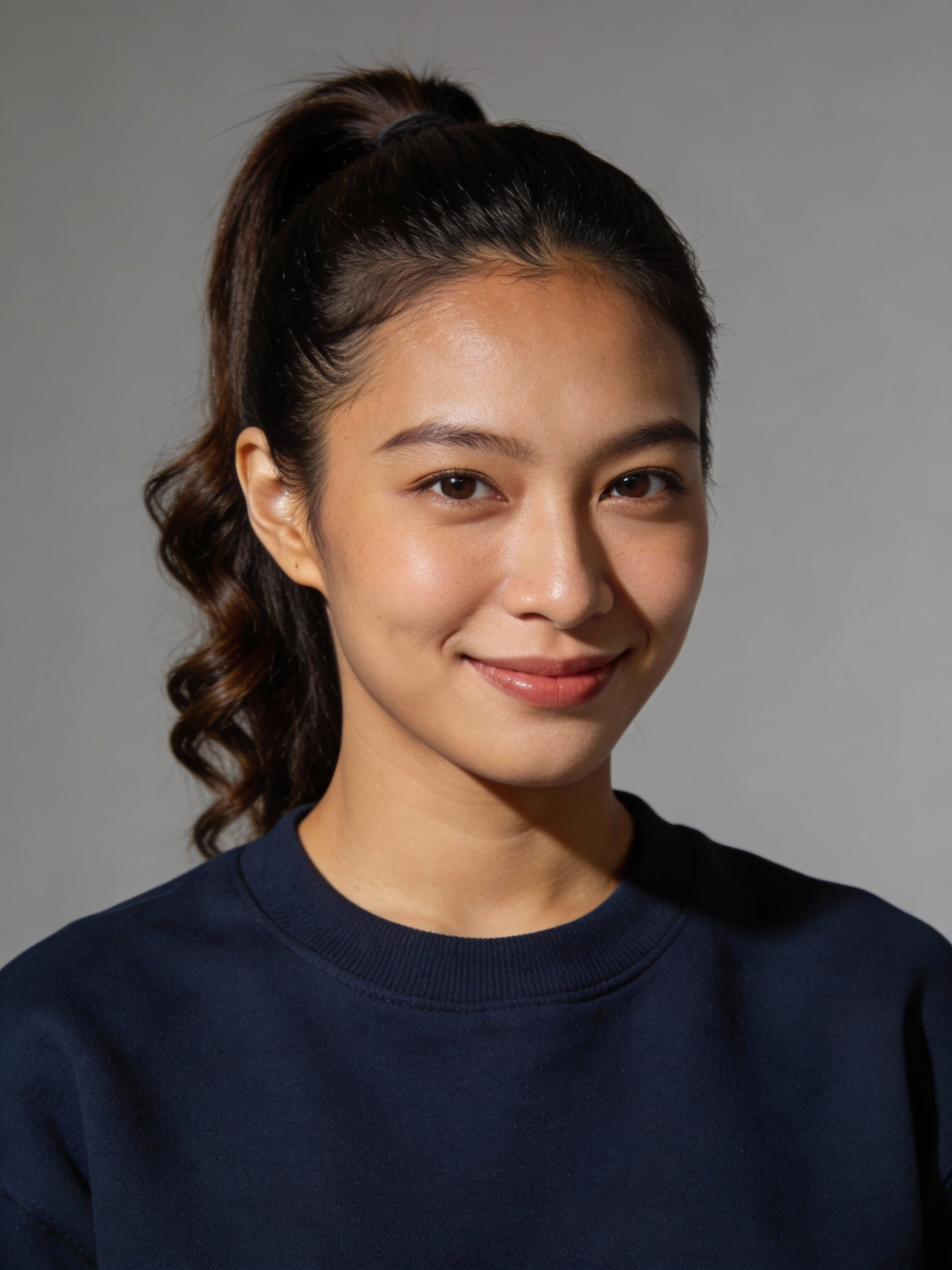 Studio portrait of a Karen female in her early 30s; medium skin, warm undertone; high ponytail with curled ends, clean side part; minimal makeup. Outfit: deep navy crewneck sweater, no logos. Neutral mid-gray seamless backdrop; Rembrandt lighting with soft fill; 105 mm macro-sharp. Expression: approachable and calm, gentle smile. Framing: 3:4; mid-chest-up, centered at eye level; full head/hair in frame; both shoulders visible.