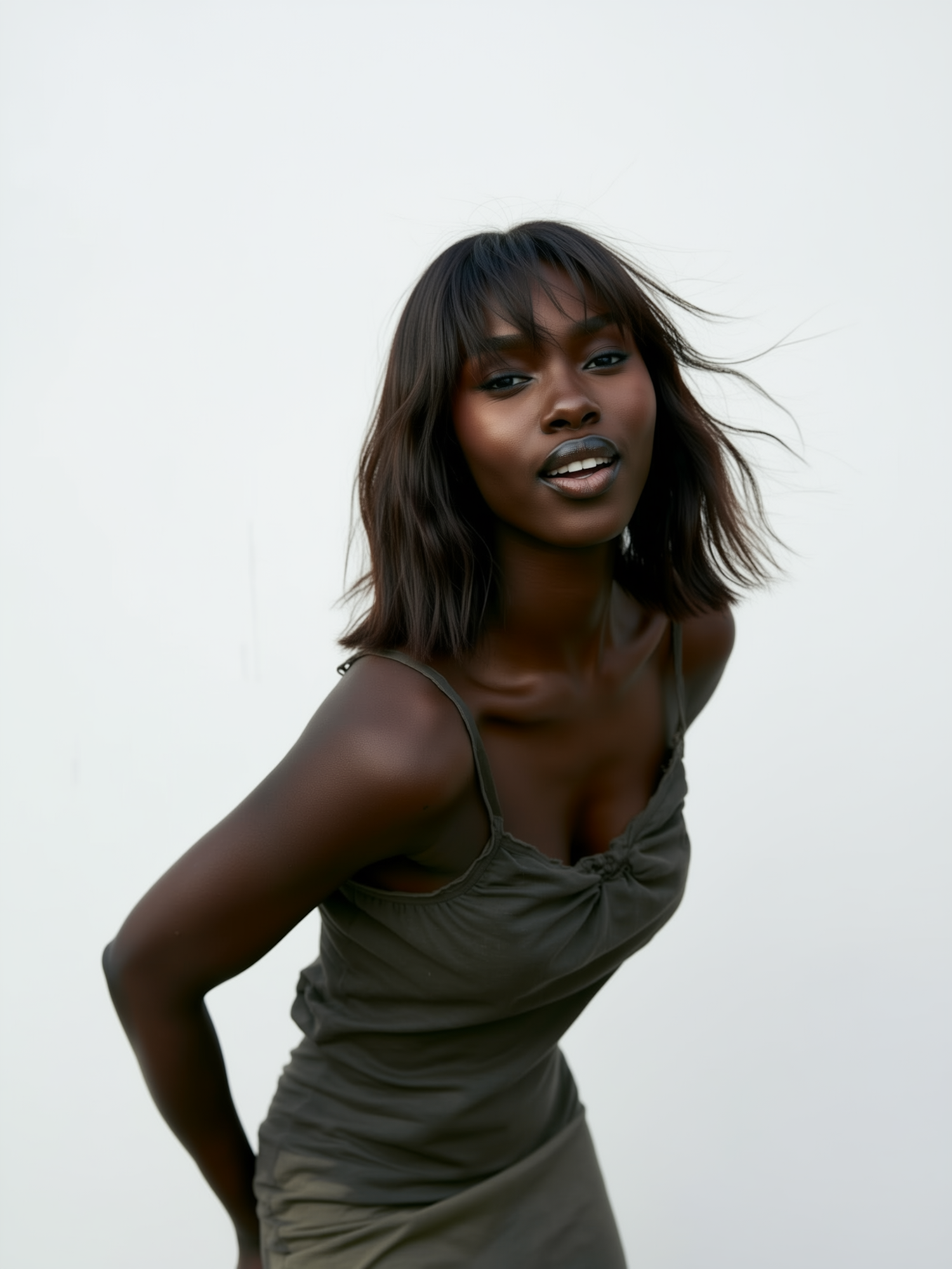 A woman with dark skin and brown hair in an olive-green dress, smiling against a plain white background.