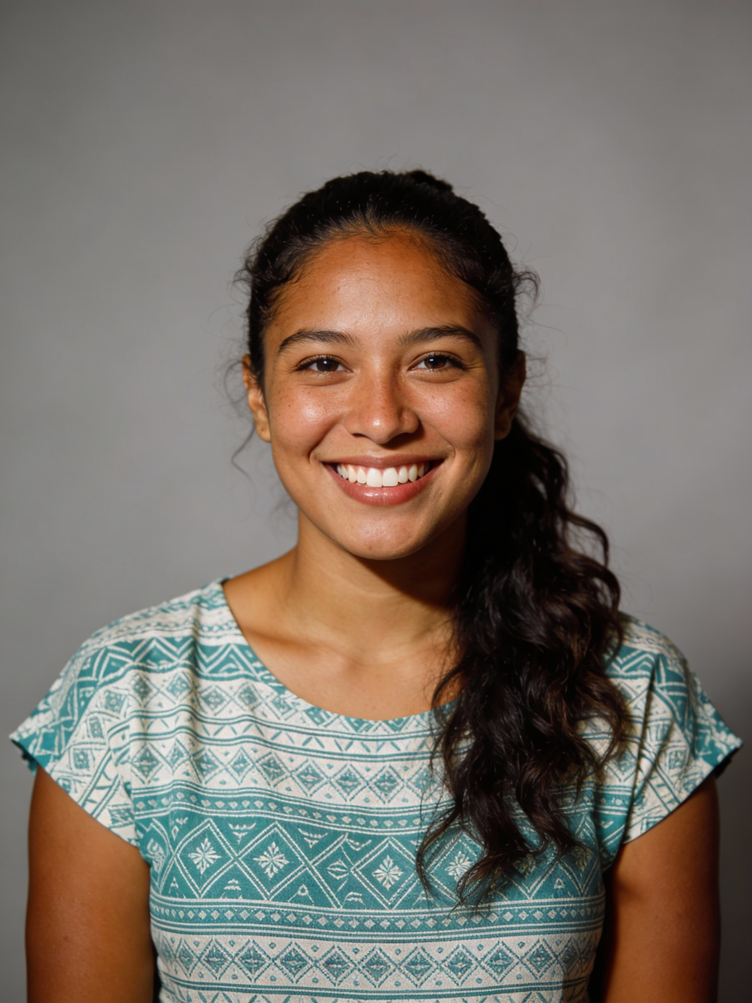 Studio portrait of a Samoan female in her late 20s; medium brown skin, warm undertone; long wavy dark hair partly tied back; wearing a short-sleeve top with a simple everyday Pacific-inspired pattern in muted teal and white, no logos; neutral mid-gray seamless backdrop; Rembrandt lighting with soft fill; 105 mm macro-sharp. Expression: bright and friendly, big smile showing teeth. Framing: portrait orientation, 3:4 ratio; mid-chest-up; centered at eye level, front view; full head and hair fully inside the frame with space above; both shoulders visible.
