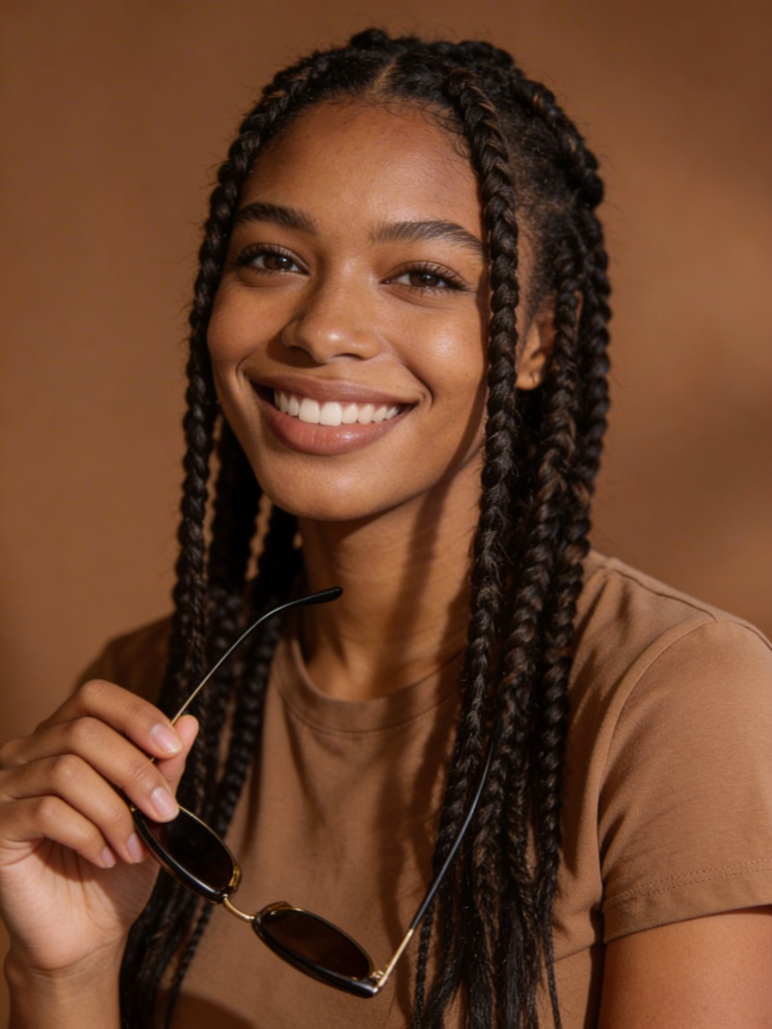 A smiling woman with braided hair holding sunglasses, set against a warm brown background, creating a natural and inviting portrait.