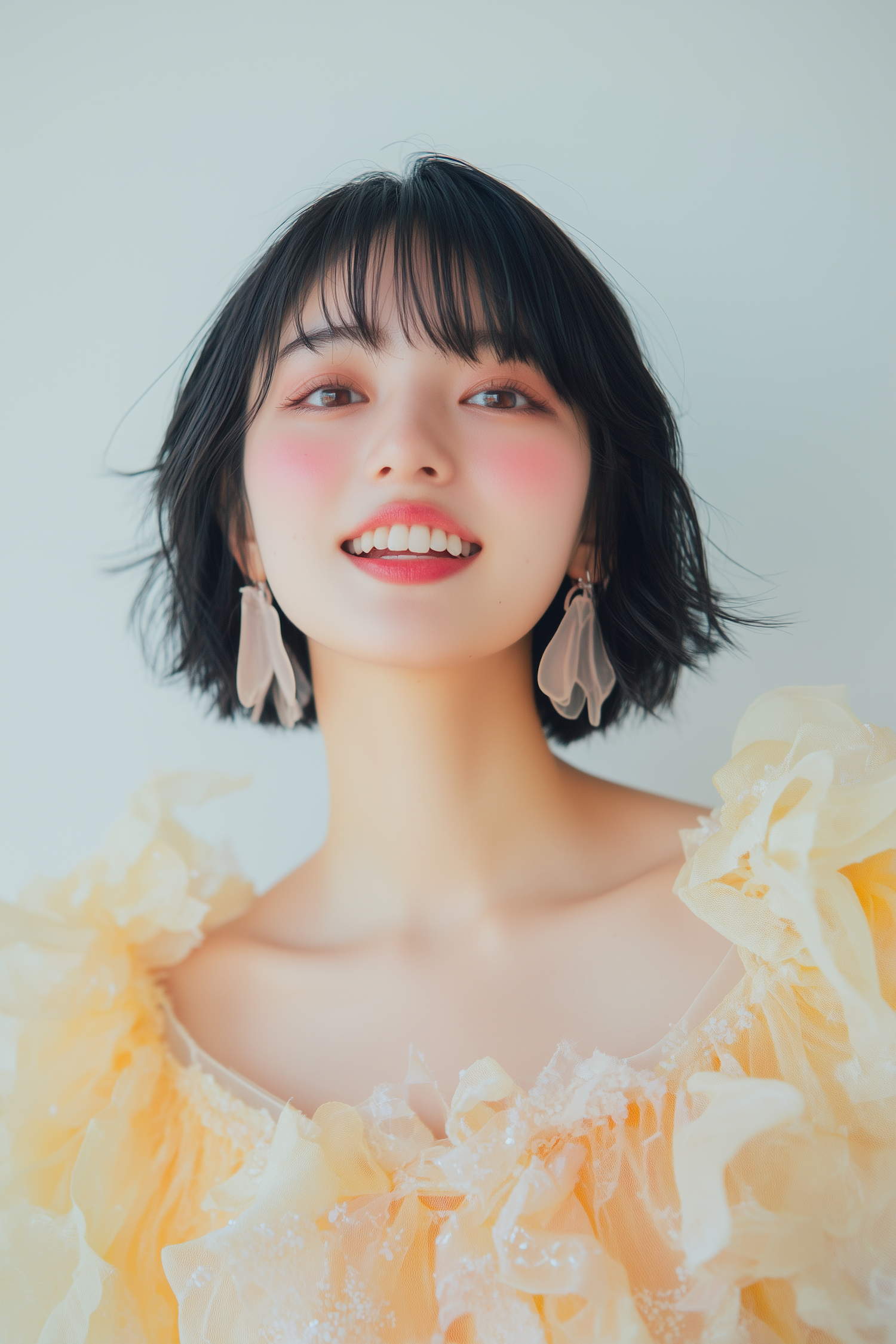 Smiling woman with short black hair, rosy cheeks, and a ruffled yellow dress, wearing translucent petal-shaped earrings.