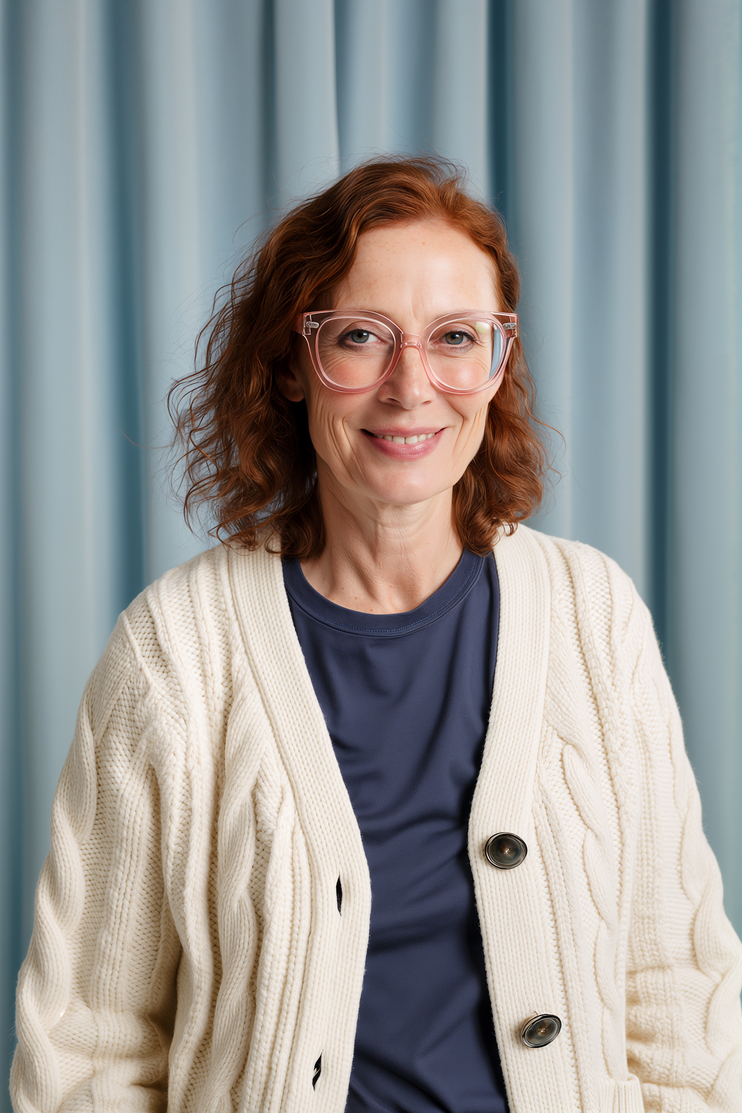 A woman with red hair, wearing glasses and a cream cardigan, smiles against a light blue curtain background.