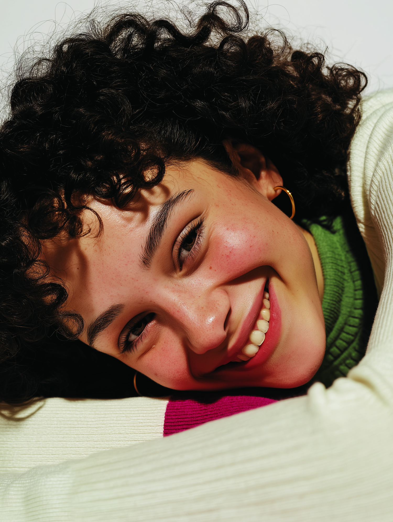 Close-up of a smiling woman with curly hair, wearing a green turtleneck and white sweater, radiating warmth and joy.