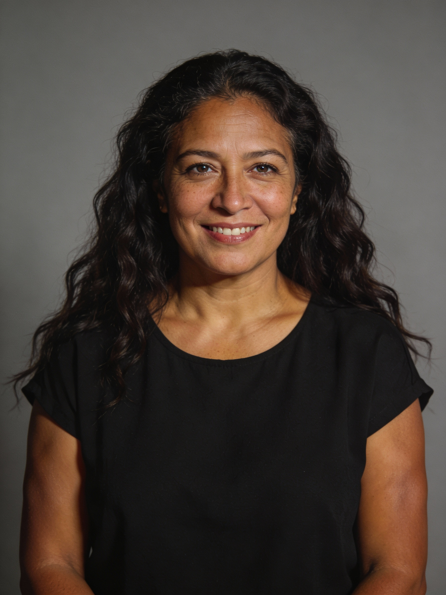 A woman with long, wavy dark hair and a warm smile, wearing a black top against a neutral background.