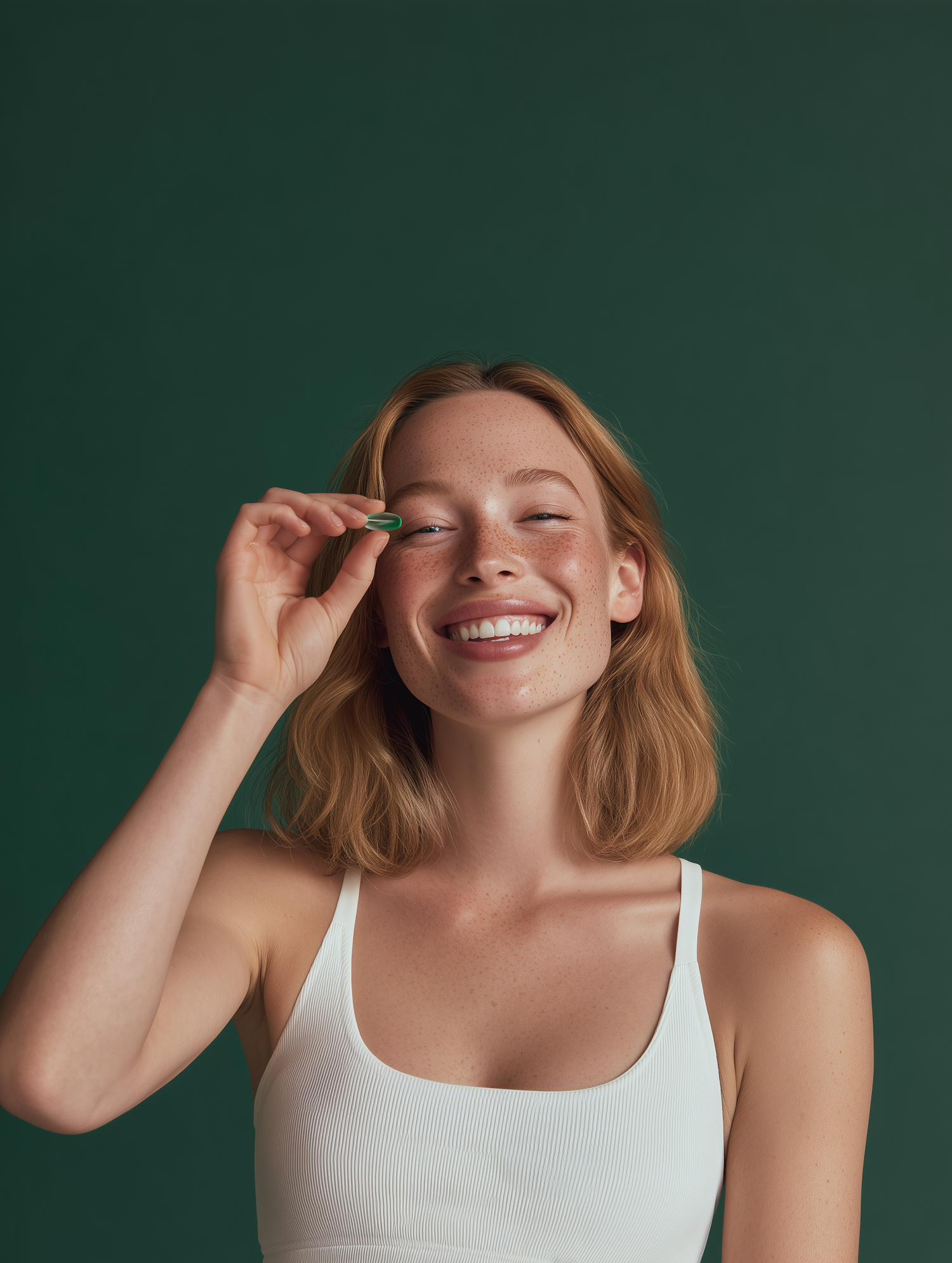 A smiling woman with freckles and light brown hair holds a green object near her face against a green background.