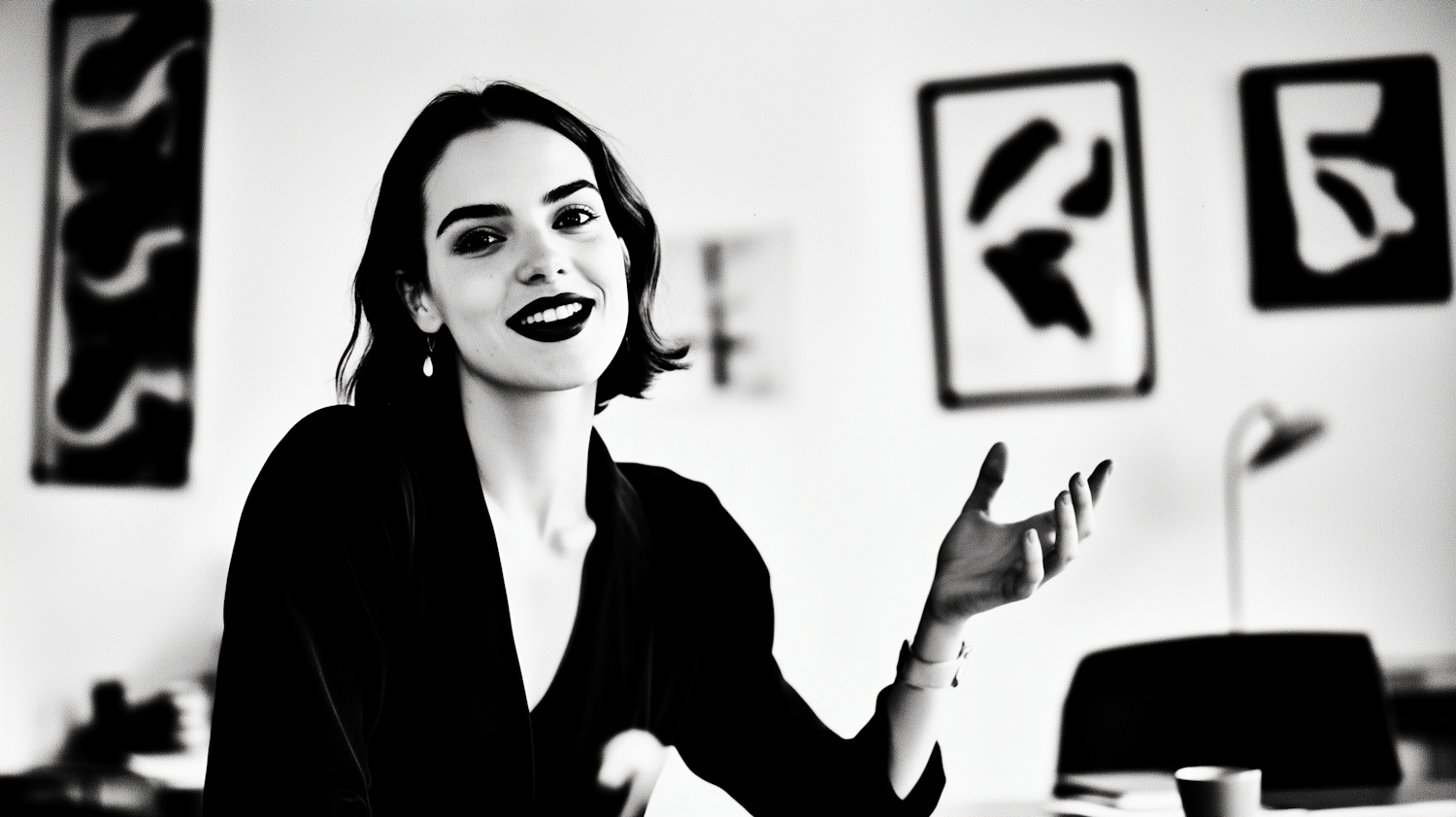 Black-and-white portrait of a smiling woman with short dark hair, gesturing in a modern room with abstract art in the background.
