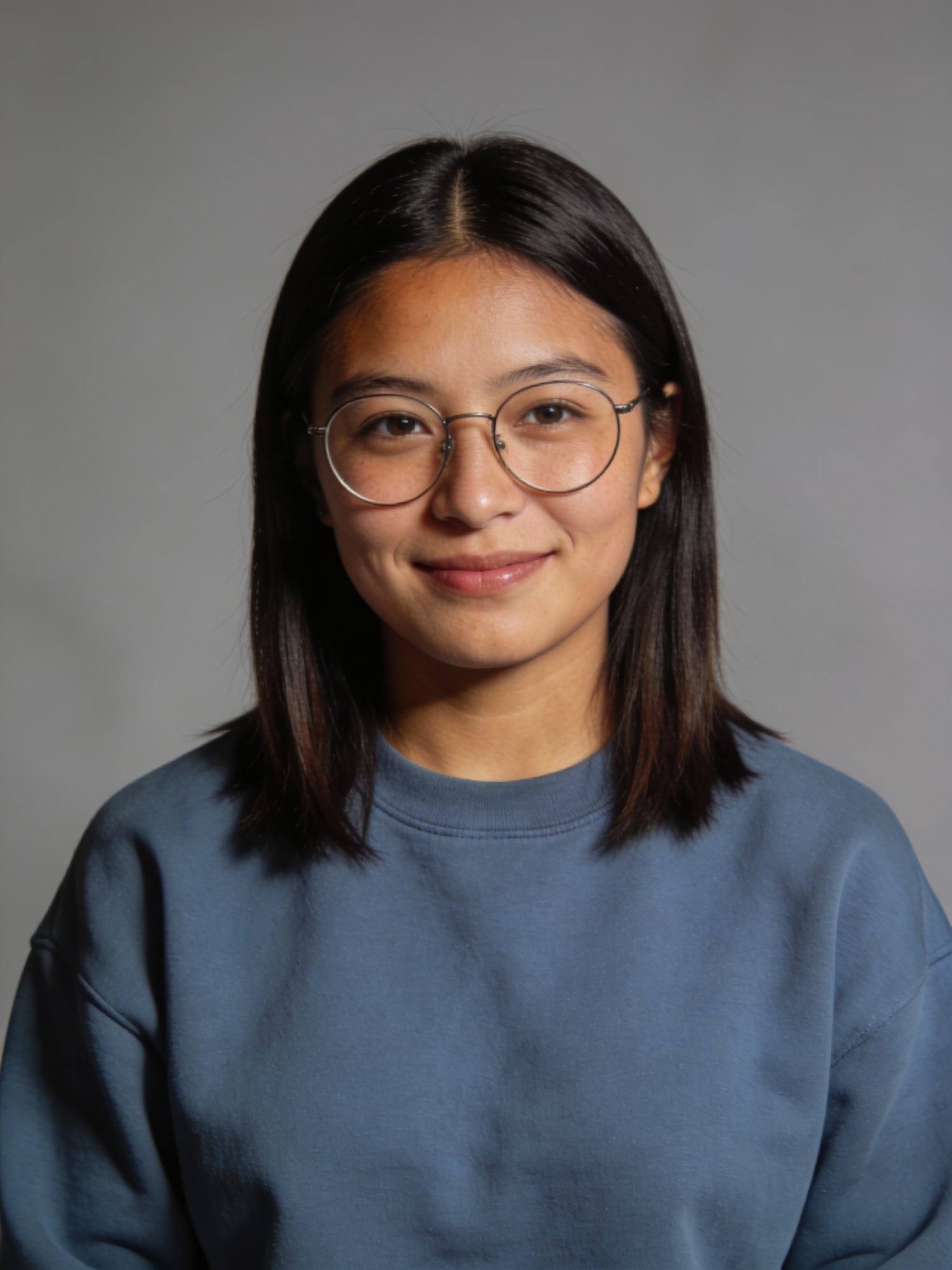 Studio portrait of a Kalaallit Inuit female in her early 30s; medium tan skin, warm undertone; straight dark hair cut to shoulder length with a center part; thin round eyeglasses; wearing a plain slate-blue crewneck sweatshirt, no logos; neutral mid-gray seamless backdrop; Rembrandt lighting with soft fill; 105 mm macro-sharp. Expression: warm and thoughtful, subtle smile. Framing: portrait orientation, 3:4 ratio; mid-chest-up, subject centered at eye level, facing directly toward the camera; full head and hair completely inside the frame with a little space above; both shoulders visible.