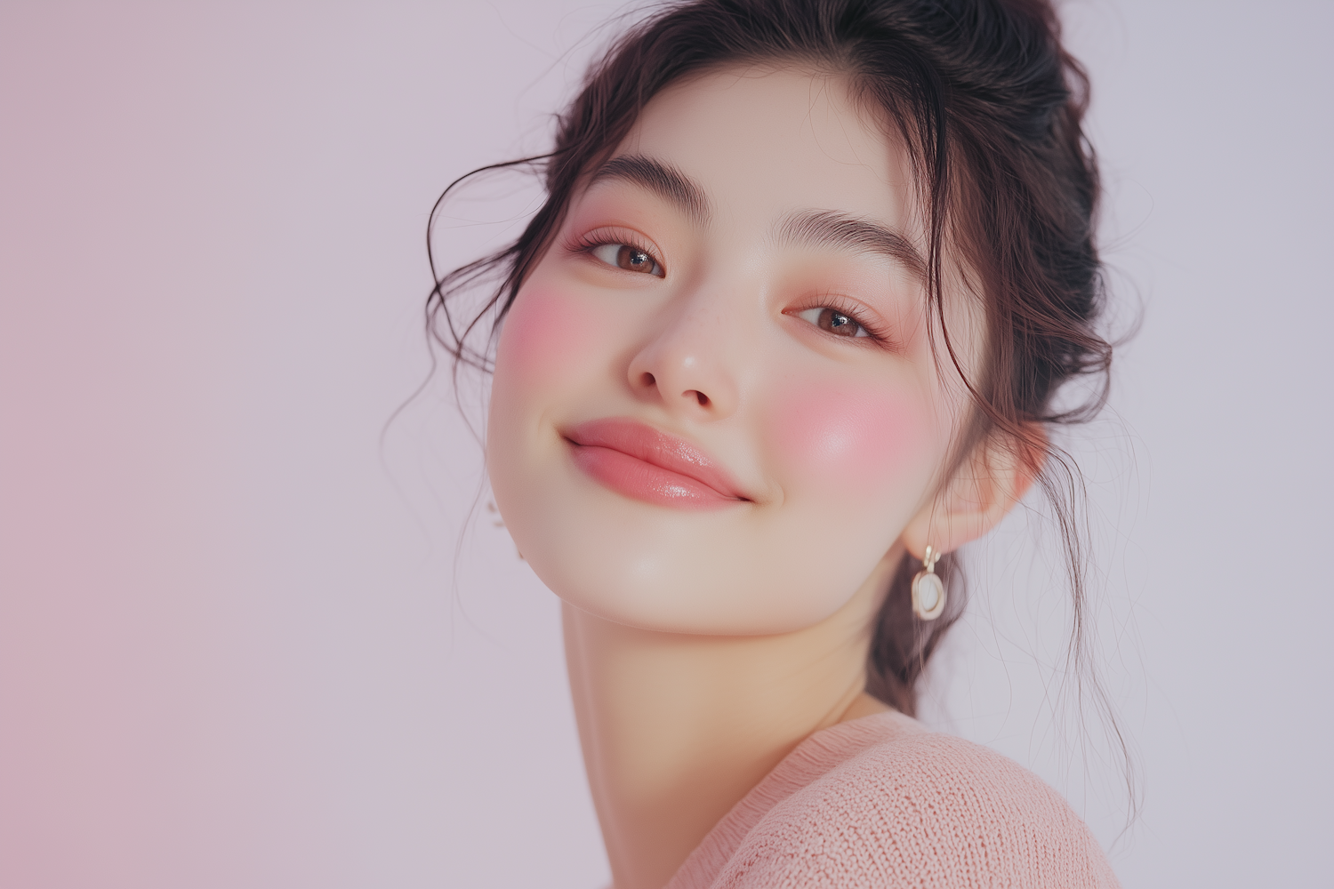 A young woman with rosy cheeks, glossy pink lips, and a soft smile, wearing a pink sweater and pearl earrings against a pastel background.