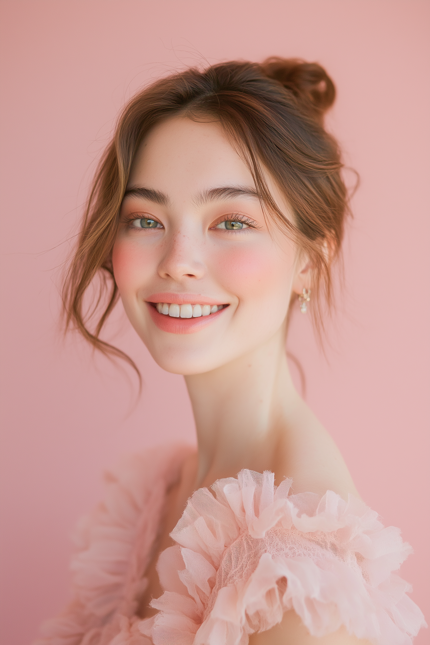 A smiling woman with green eyes, light brown hair, and a pink ruffled dress against a soft pink background. Romantic and elegant vibe.
