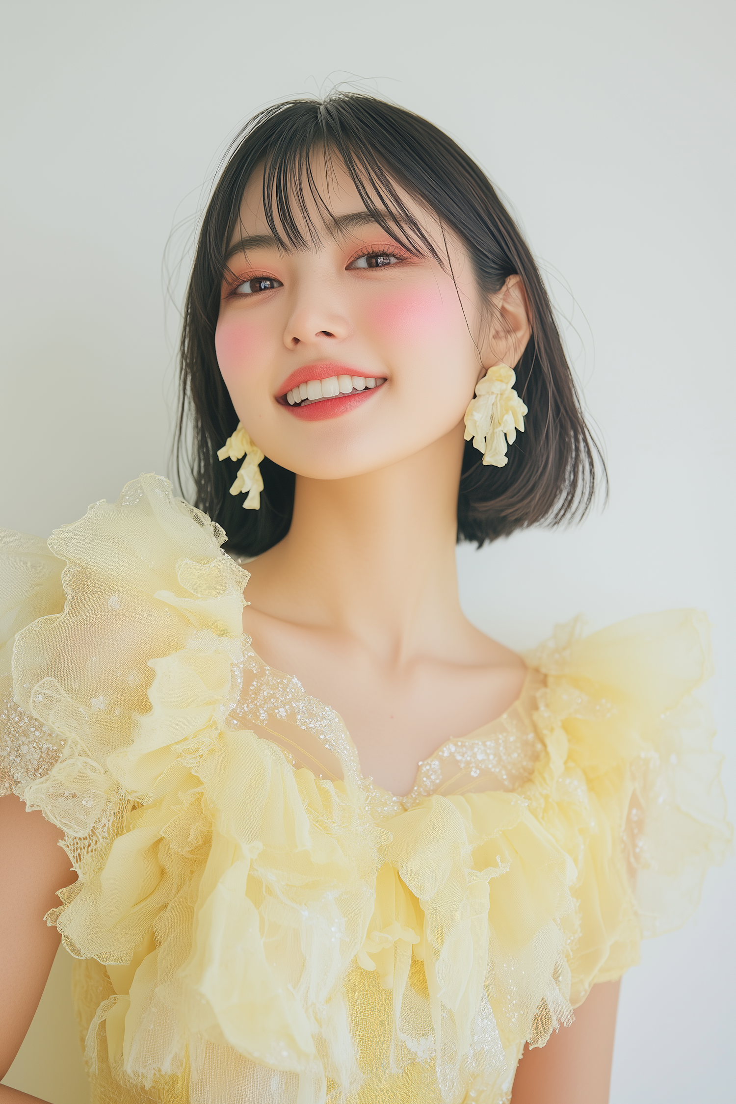Smiling woman in a ruffled yellow dress with floral earrings, rosy cheeks, and bright lipstick against a light background.