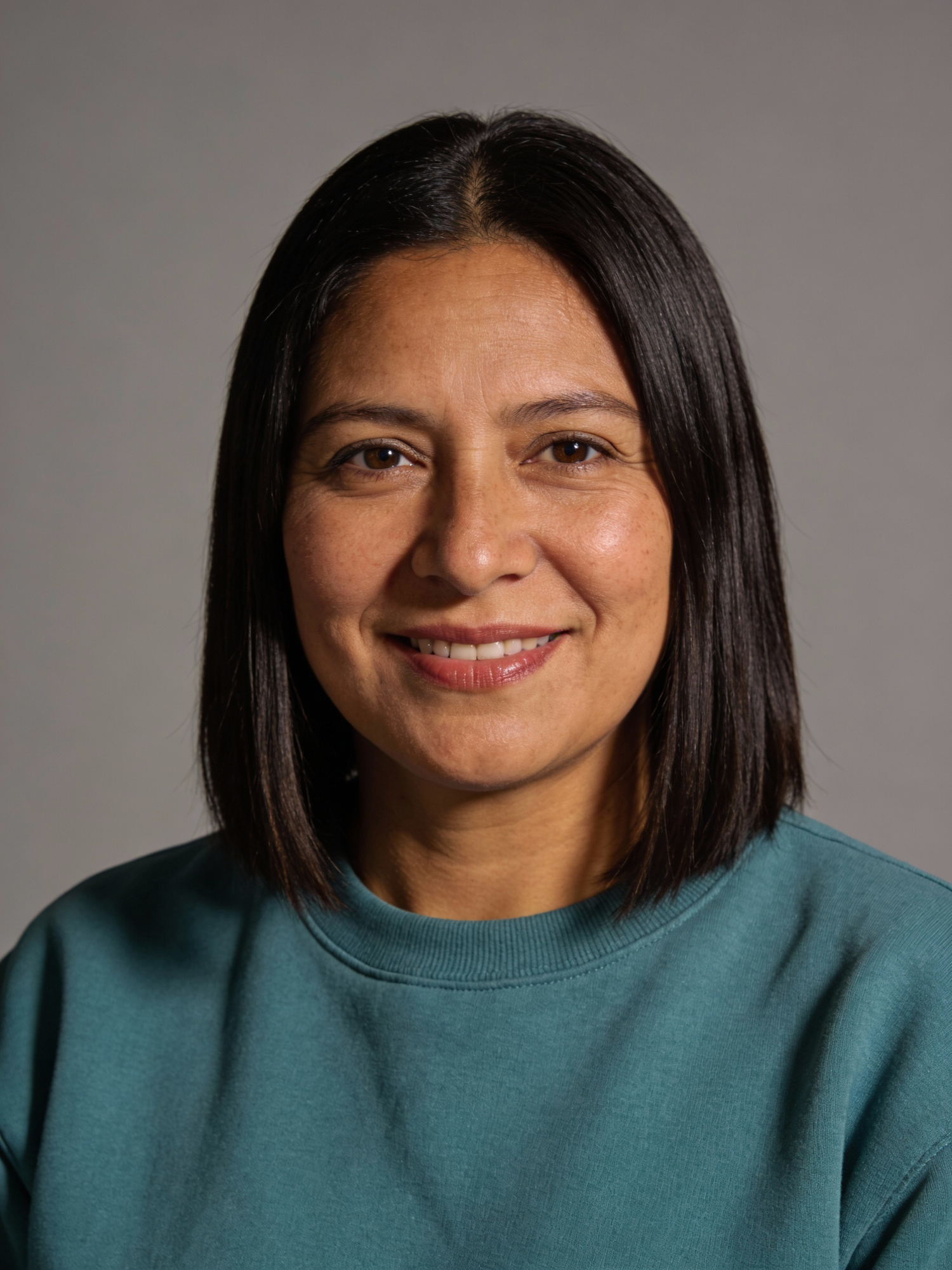 Studio portrait of a Quechua female in her early 40s; medium tan skin, warm undertone; straight dark hair cut to shoulder length; minimal makeup; wearing a muted teal sweatshirt, no logos; neutral mid-gray seamless backdrop; Rembrandt lighting with soft fill; 105 mm macro-sharp. Expression: kind and composed, subtle smile. Framing: portrait orientation, 3:4 ratio; mid-chest-up, centered at eye level, facing camera; full head and hair inside frame with a little space above; both shoulders visible.