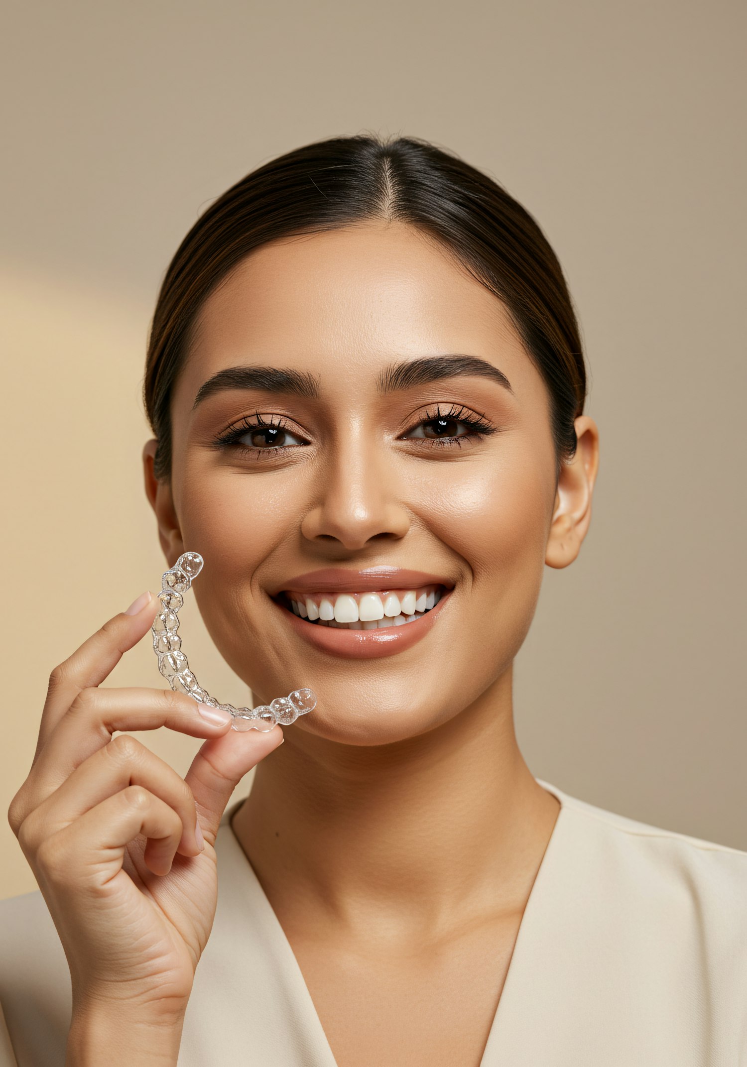 A smiling woman holding a clear dental aligner, showcasing her bright teeth and glowing complexion against a neutral background.