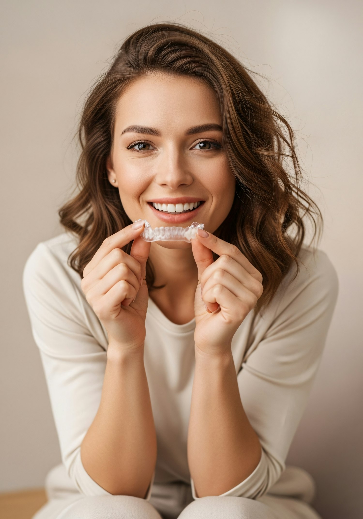A smiling woman holding a clear dental aligner, showcasing a clean and professional aesthetic with a neutral background.