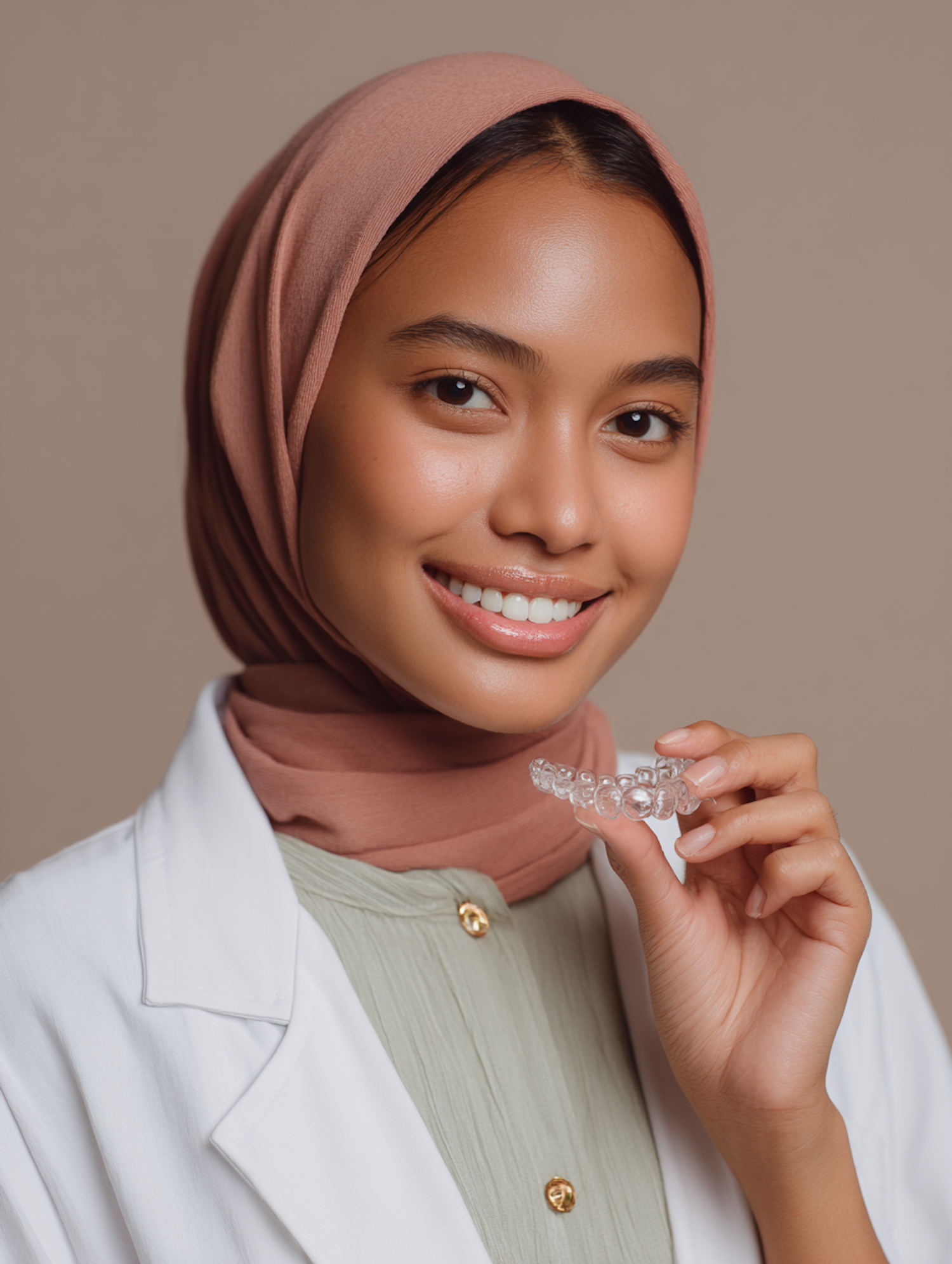 A smiling woman in a hijab holds a clear dental aligner, dressed professionally in a white coat and green blouse.
