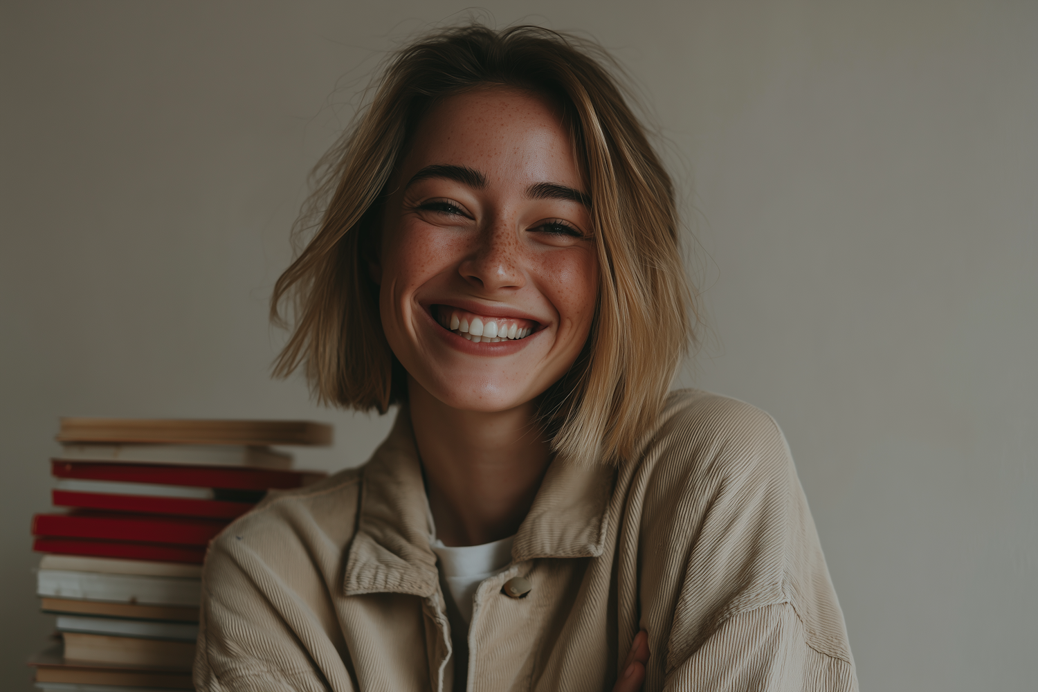 Smiling woman with short blonde hair and freckles, wearing a beige jacket, with a stack of books in the background.