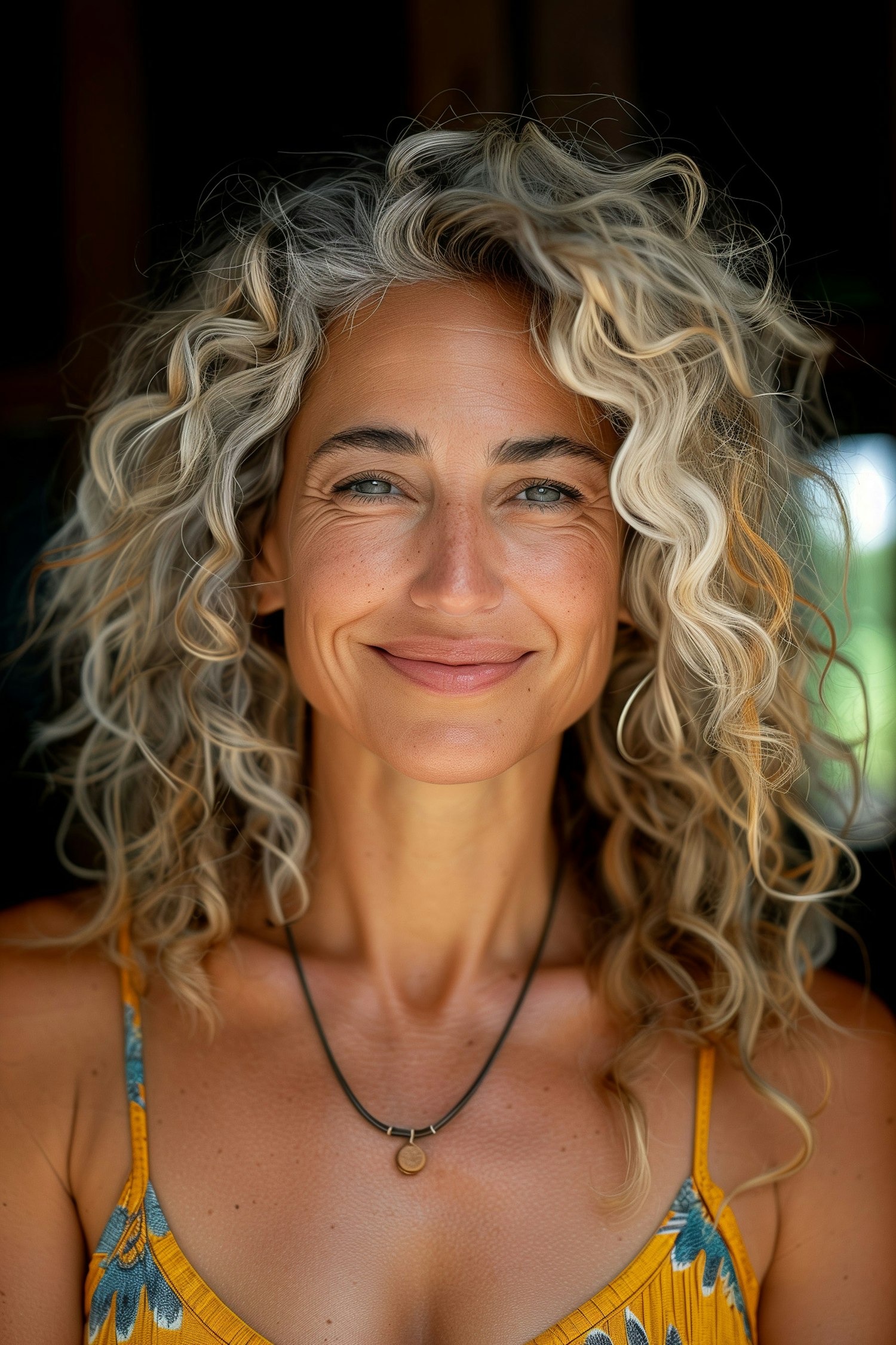 Smiling woman with curly blonde hair and blue eyes, wearing a yellow floral dress and necklace, against a dark background.