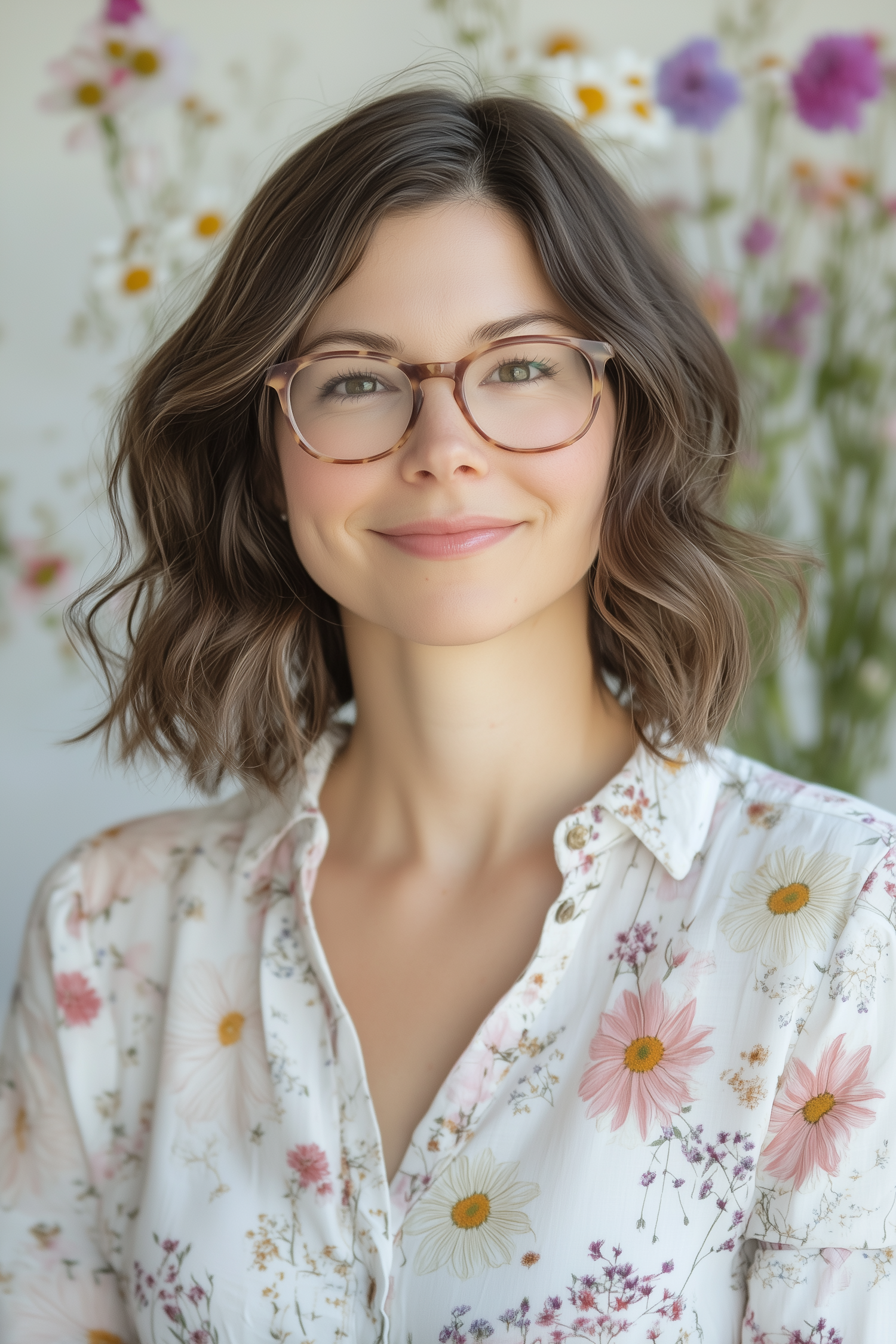 Smiling woman with wavy brown hair, tortoiseshell glasses, and floral blouse against a blurred wildflower background.