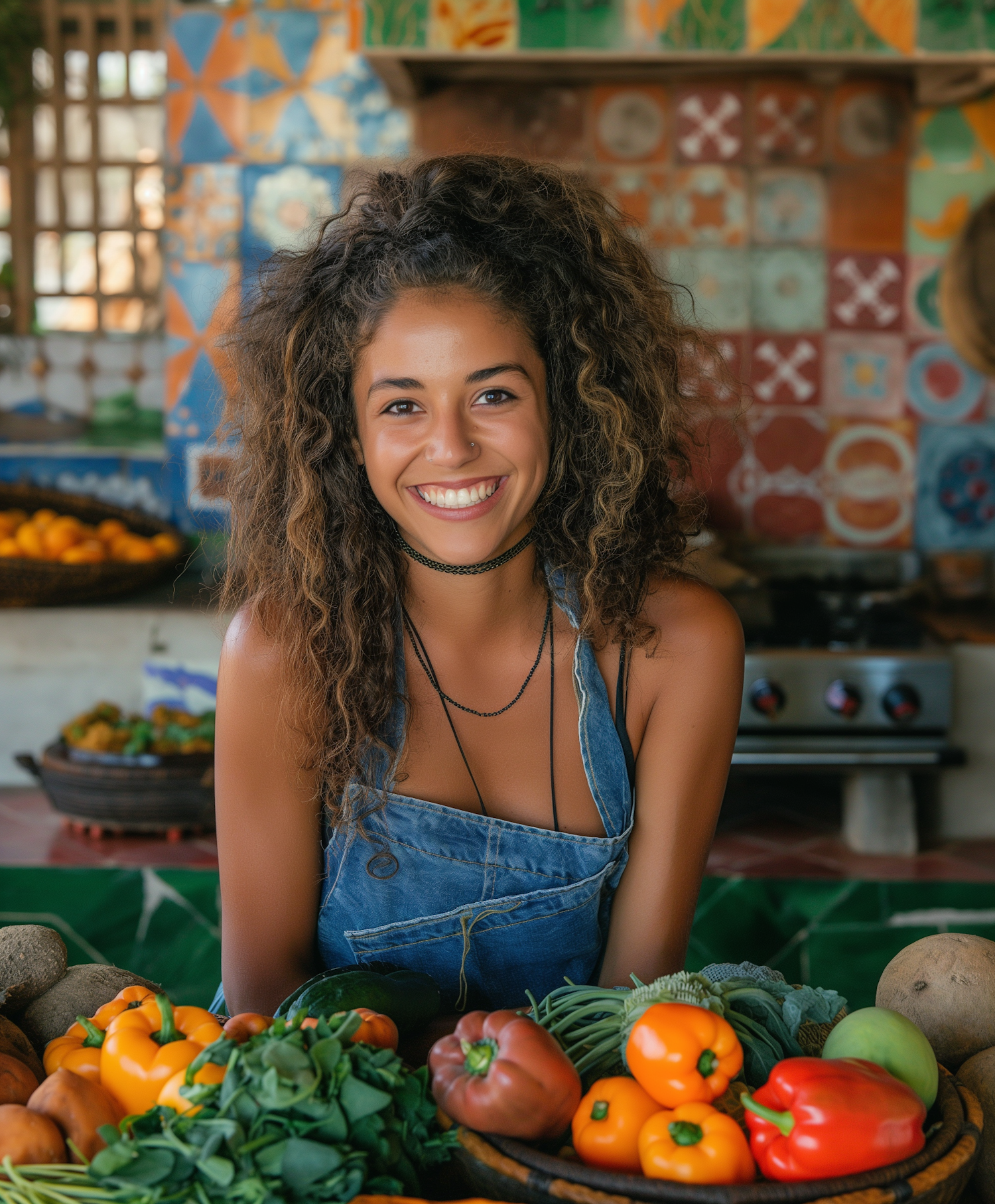 Smiling woman with curly hair in a denim apron, surrounded by colorful fresh vegetables and vibrant tiled background.