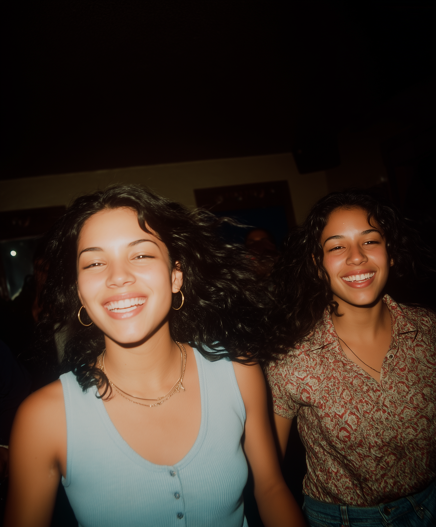 Two young women with curly hair and bright smiles enjoying a lively indoor setting, dressed casually in a blue top and patterned shirt.