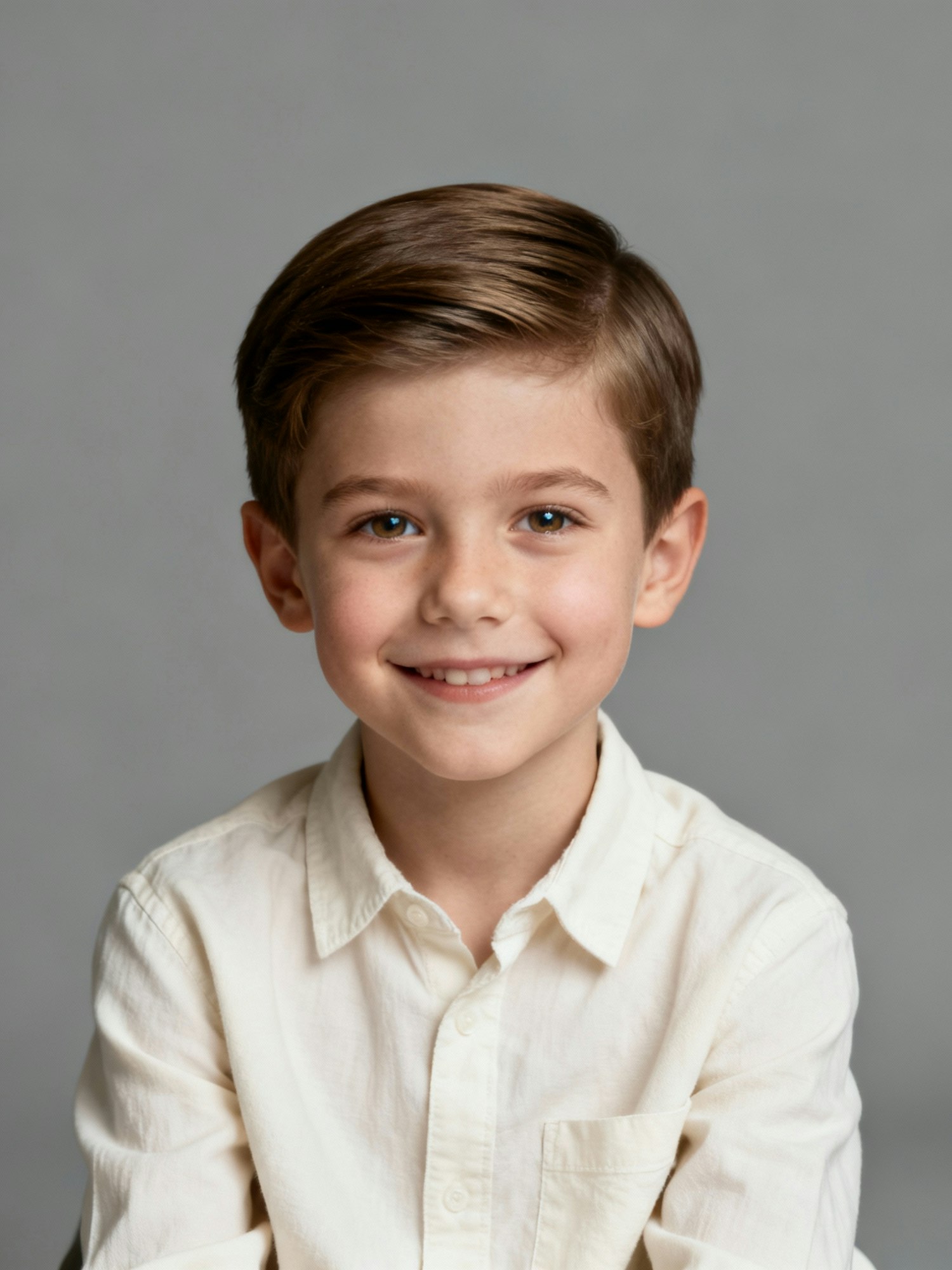 Editorial studio portrait of a child, around 6 years old german boy ; joyful and calm expression, eyes bright and natural; clean, cohesive style for a global portrait series. Lighting: clamshell setup with soft key and gentle rim, balanced at 5500 K for even skin tone; soft reflection on eyes for a natural glow. Backdrop: neutral seamless (mid-gray with subtle vignette). Lens: 105 mm macro-sharp detail; photorealistic, editorial quality. Skin: light skin, neutral undertone; chestnut hair combed neatly Clothing: cream cotton shirt; gentle smile Expression: genuine joy, calm confidence. Negative: harsh shadows, filters, brand logos, watermark, exaggerated features, overly stylized lighting.