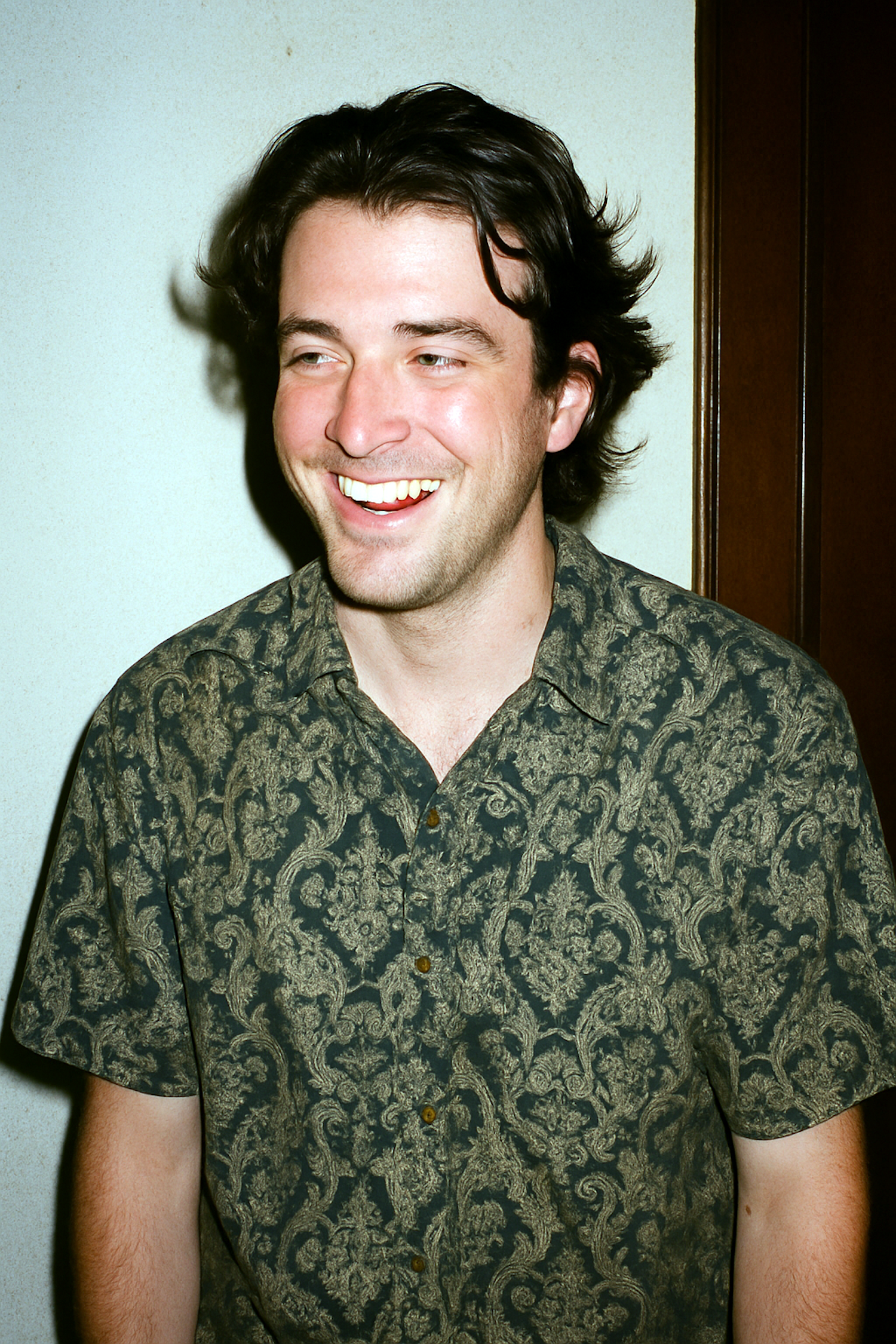 Smiling young man in a patterned green shirt, standing against a plain white wall with a wooden doorframe in the background.