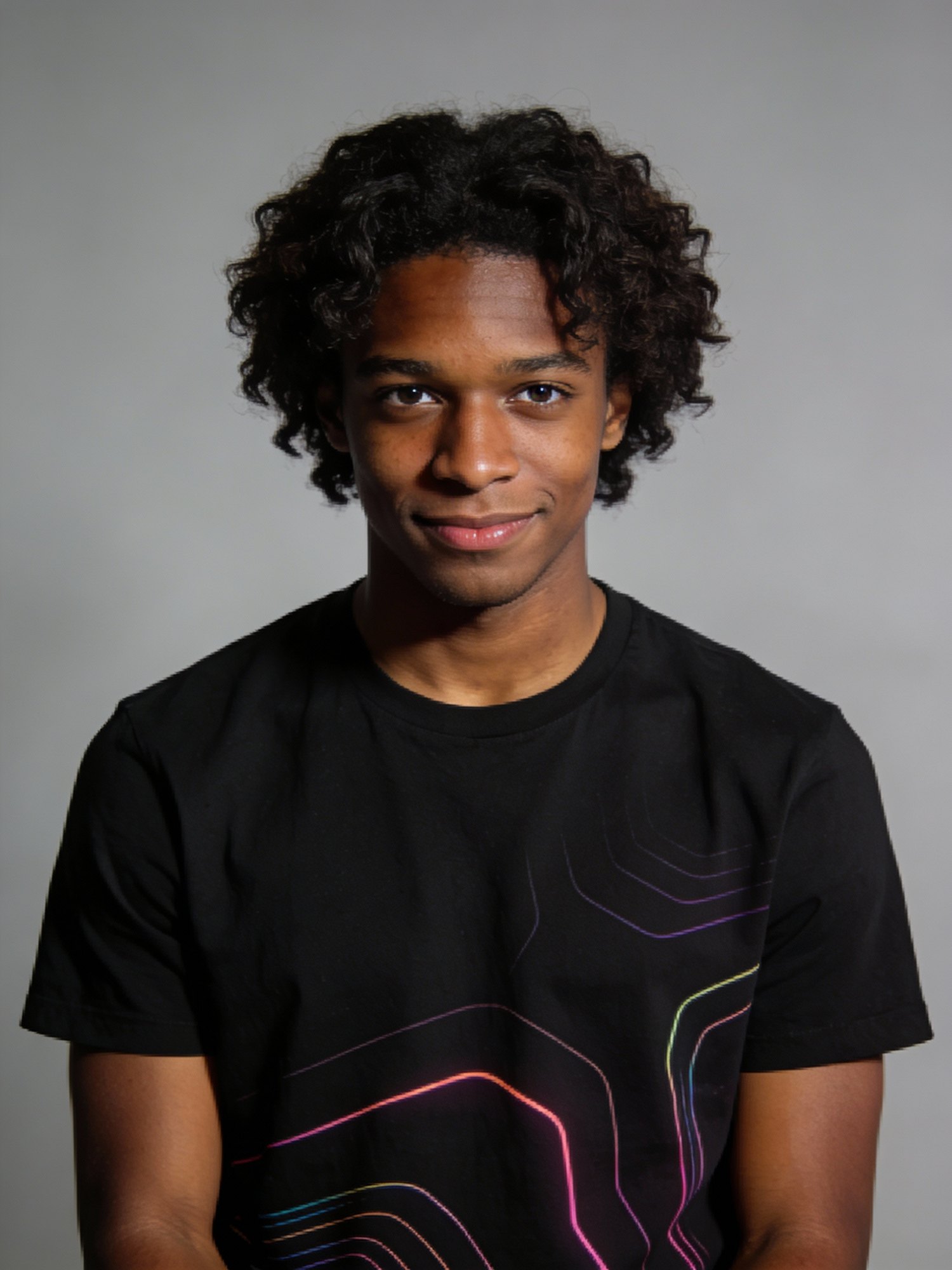 A young man with curly hair and a black t-shirt featuring a colorful design smiles gently against a neutral gray background.