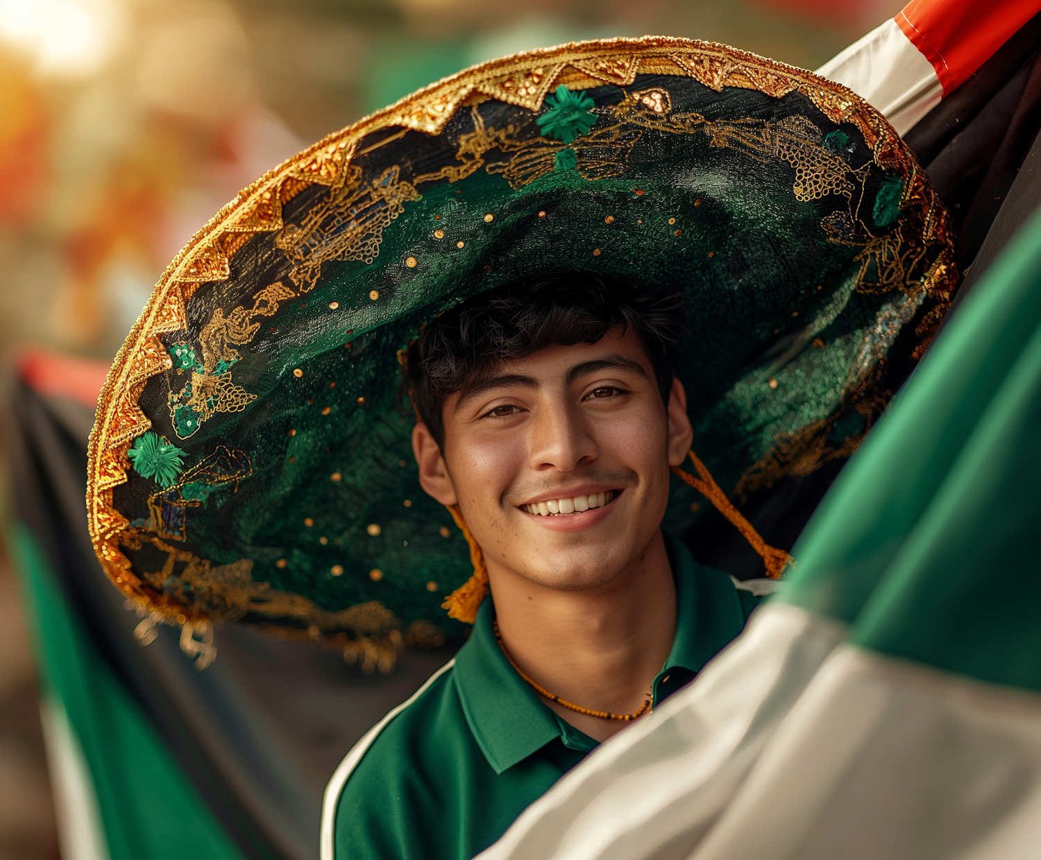 Young Hispanic male in a festive sombrero, smiling warmly. Vibrant colors and warm lighting create a cheerful atmosphere.