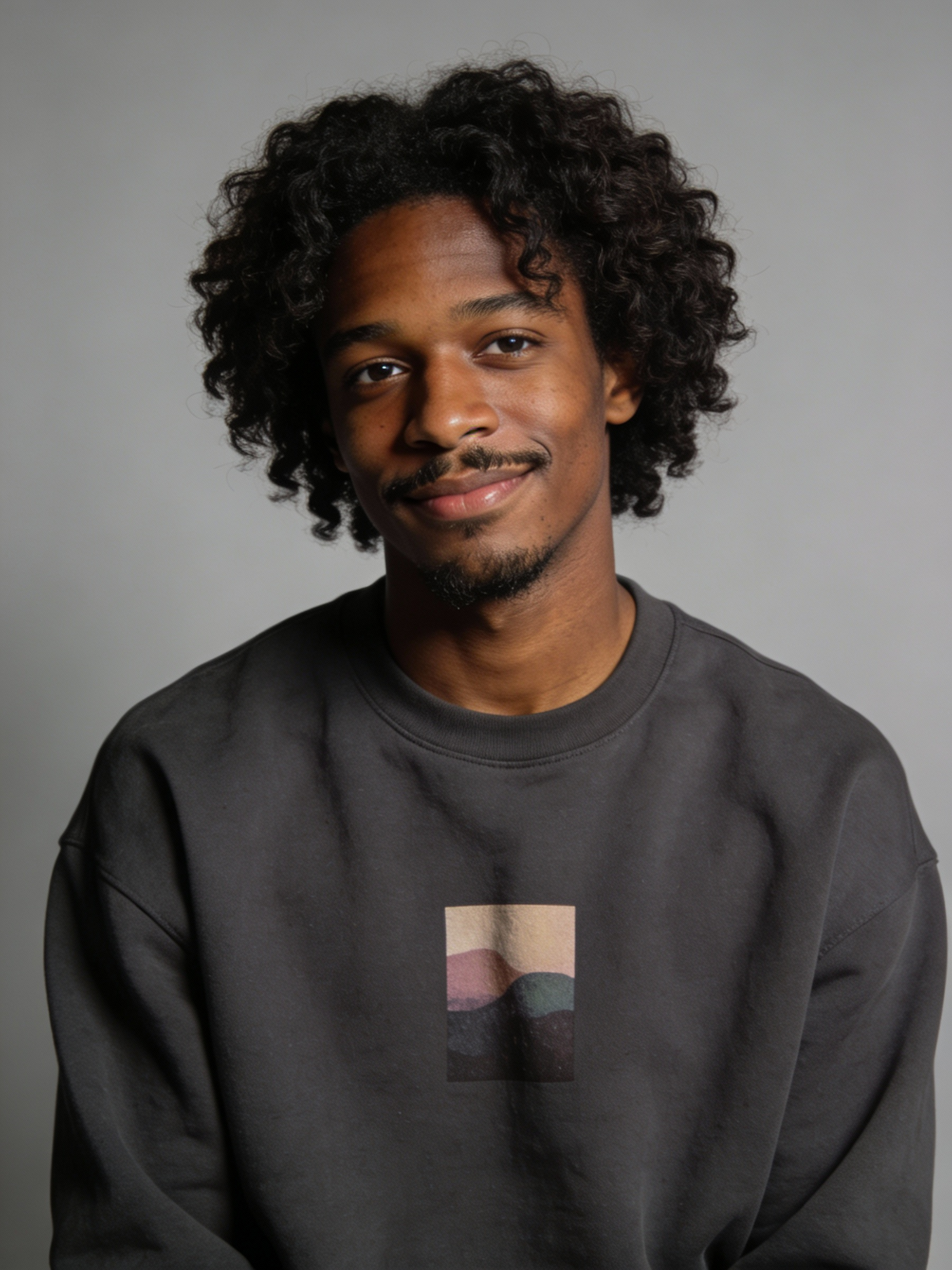 A young man with curly hair and a warm smile wearing a dark sweatshirt with a minimalist design, set against a neutral background.