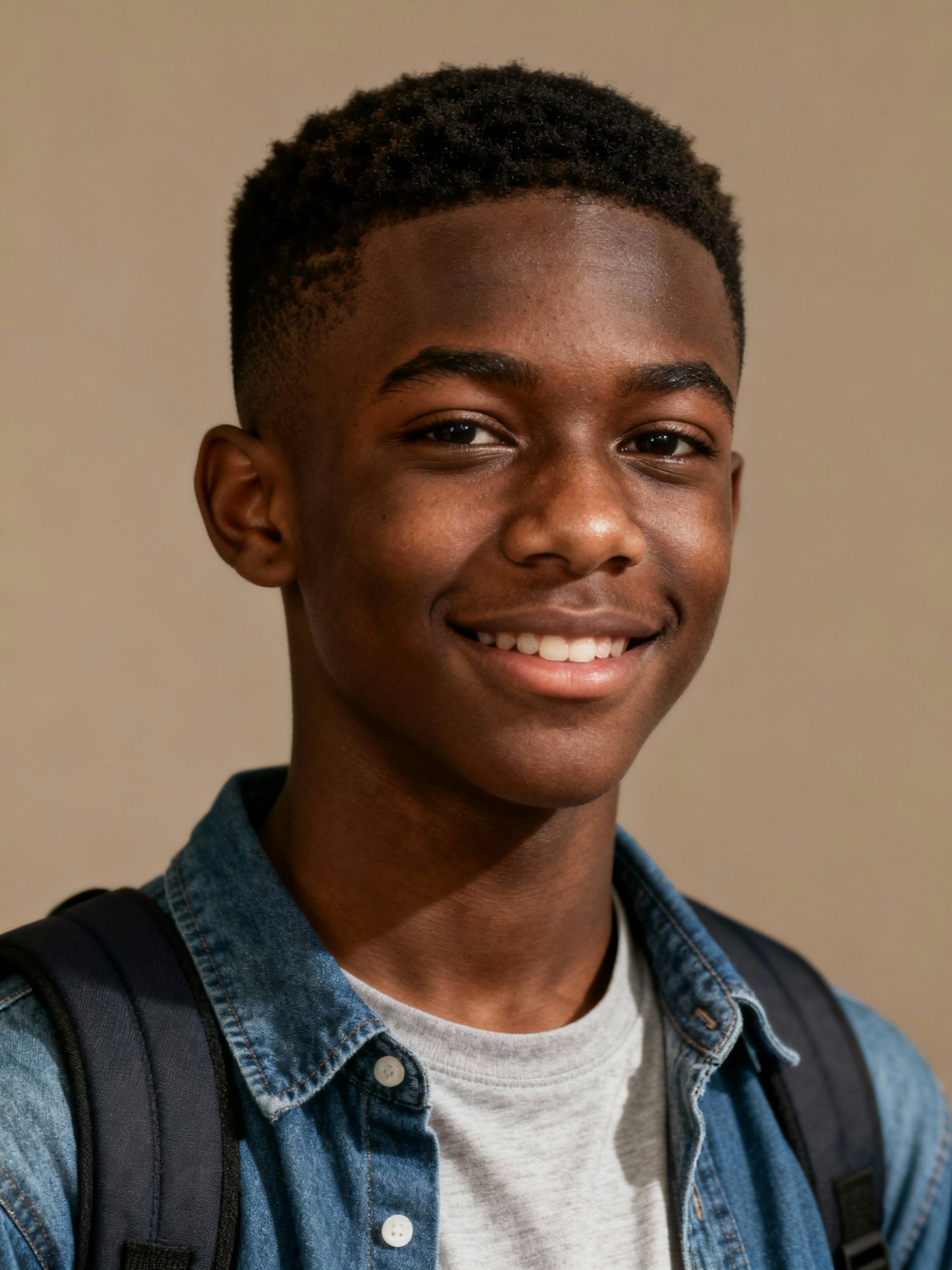 Studio portrait of a Black male high-school student; warm deep skin; short textured fade haircut; casual t-shirt under denim overshirt; neutral seamless backdrop; Rembrandt lighting; 105 mm macro-sharp; photorealistic. A simple backpack strap rests over one shoulder. Expression: confident, easygoing. Negative: brand logos, harsh contrast.