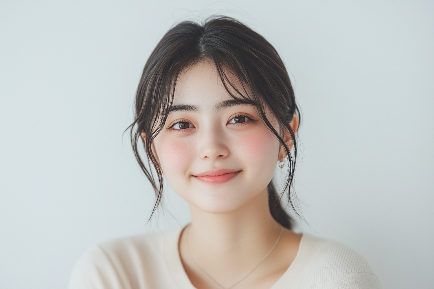 A young woman with rosy cheeks and a warm smile, wearing a cream sweater and silver necklace against a soft pastel background.