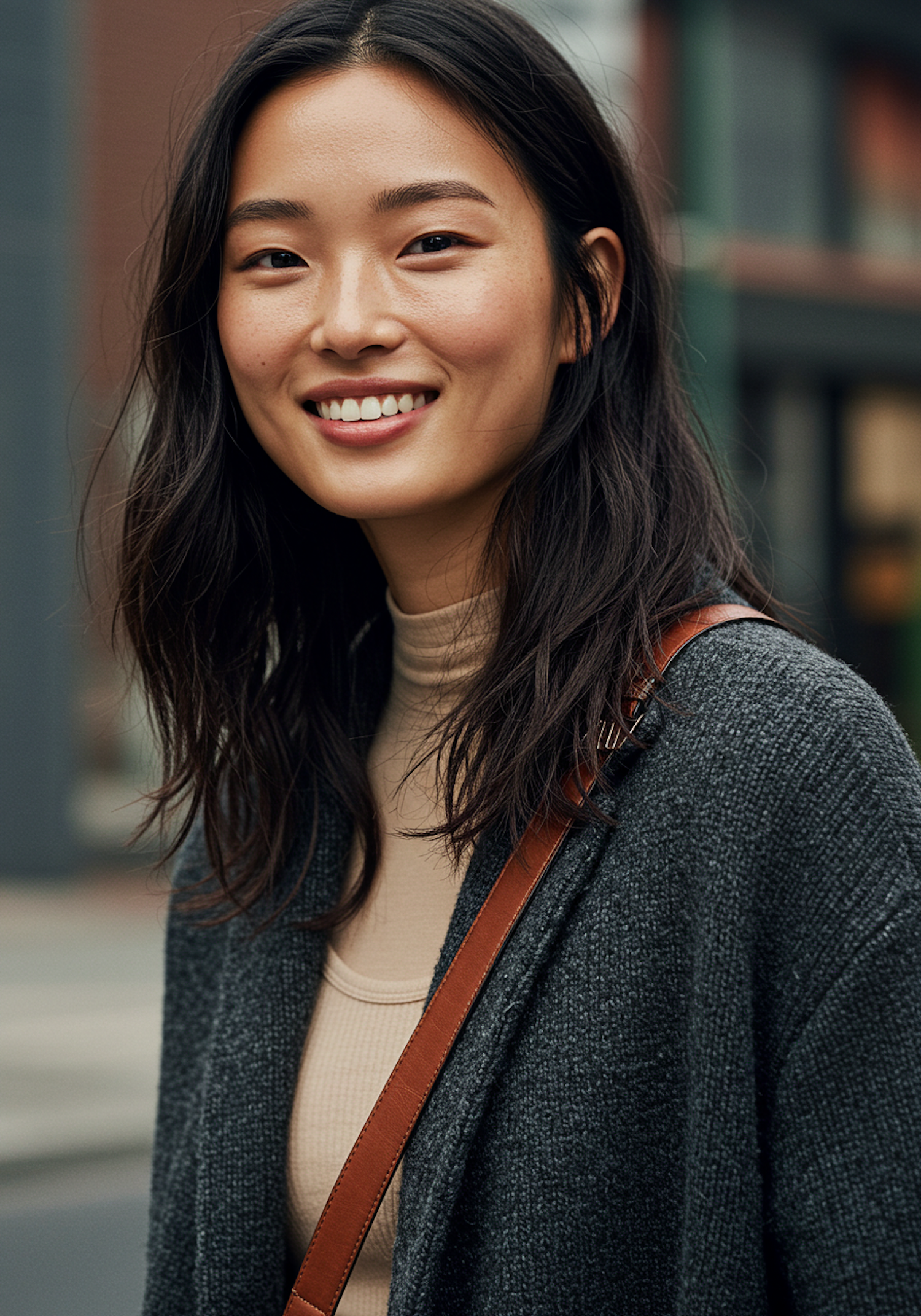 Smiling young woman with long dark hair, wearing a beige turtleneck and gray cardigan, in an urban outdoor setting.