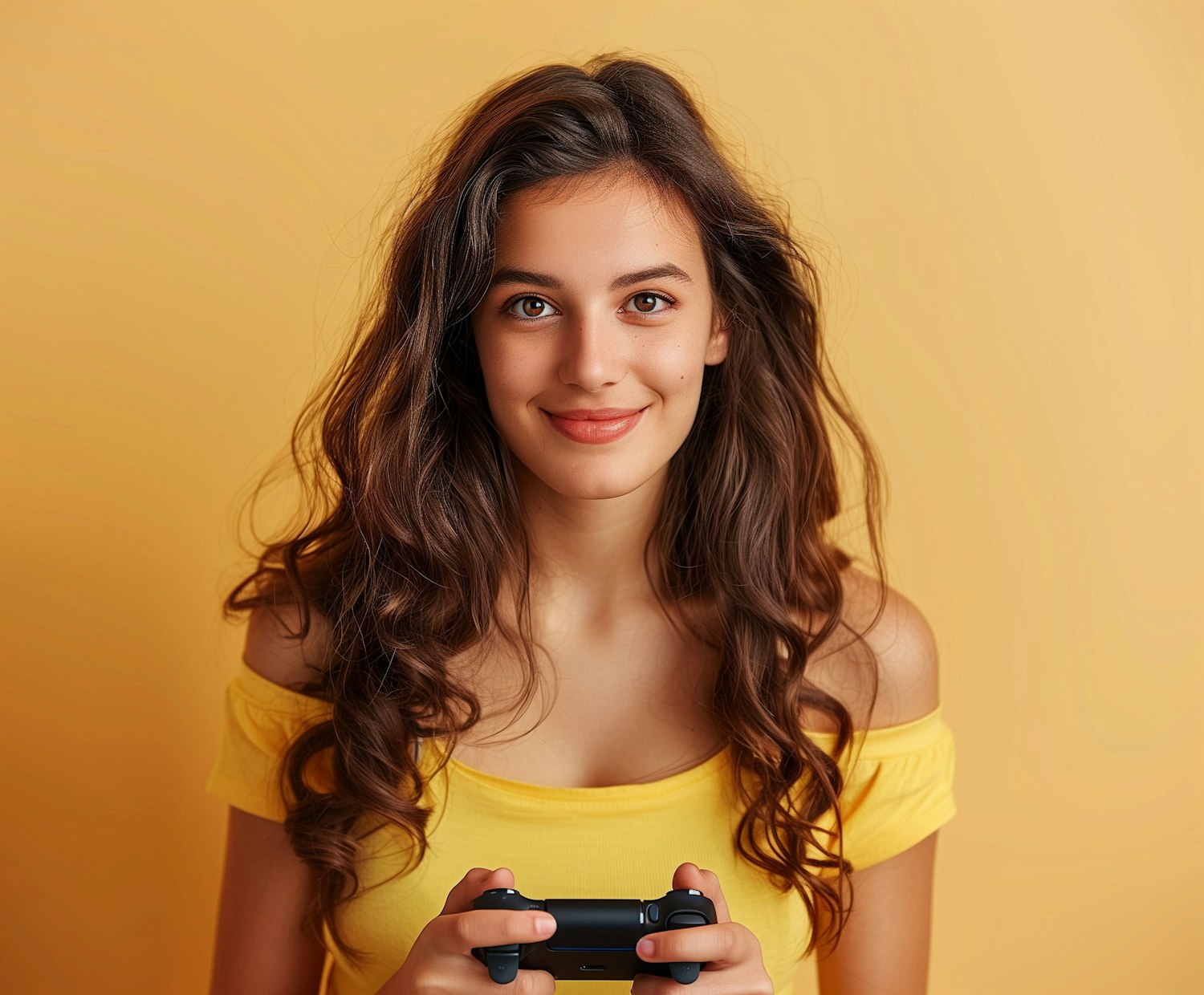 Young woman with wavy brown hair and yellow top holding a game controller, smiling against a warm yellow background.