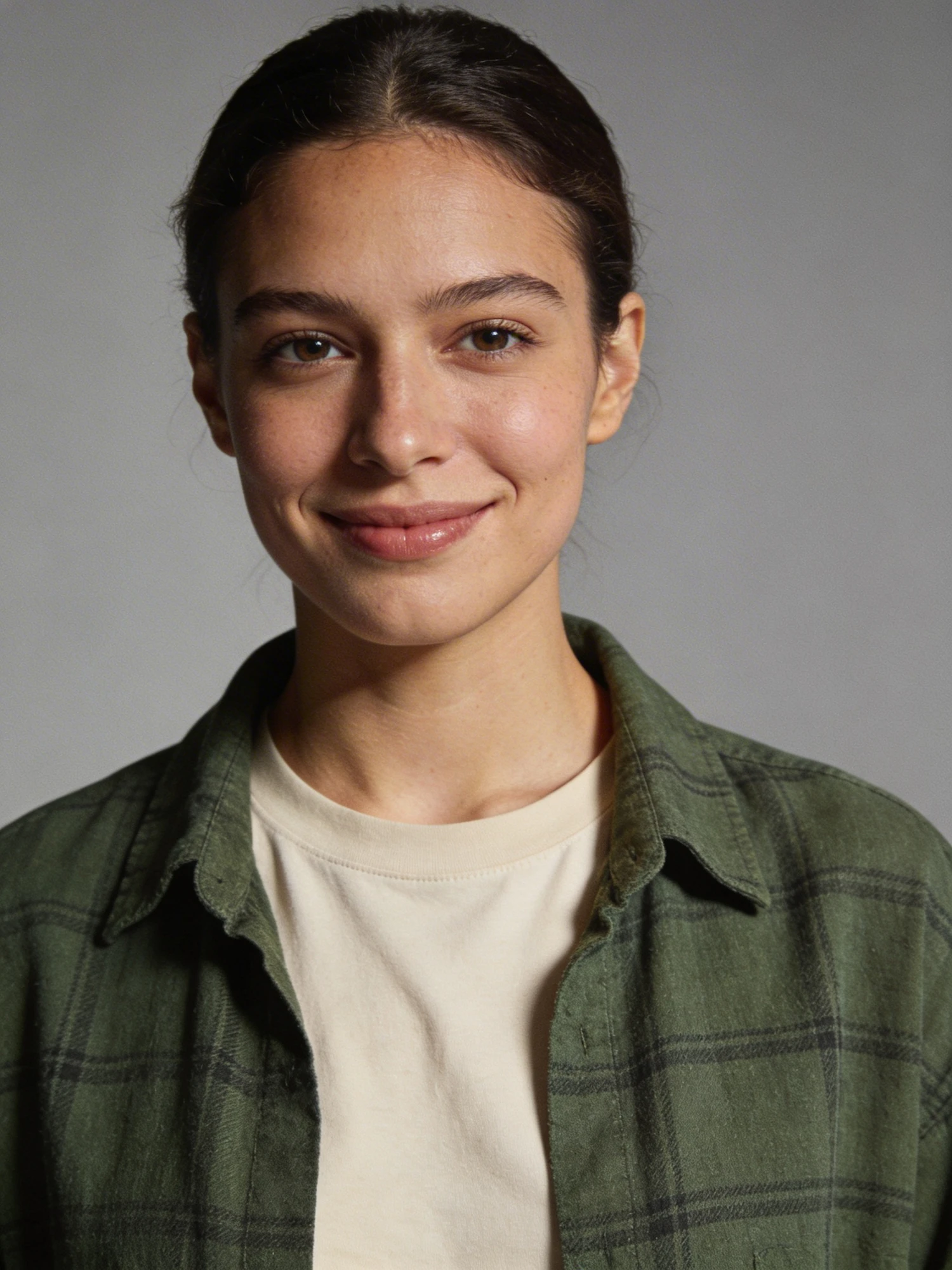 Studio portrait of a woman in her late 20s; minimal natural makeup; wearing a plain soft beige crew-neck t-shirt under a forest-green flannel overshirt, no logos; neutral mid-gray seamless backdrop; Rembrandt lighting with soft fill; 105 mm macro-sharp. Expression: easygoing and friendly, gentle relaxed smile. Framing: portrait orientation, 3:4 ratio; mid-chest-up composition. Subject centered in frame, camera at eye level, facing directly toward the camera (front view). Full head completely inside the frame with a little space above; both shoulders visible, no cropping at the top or sides. Neutral studio composition, no props.
