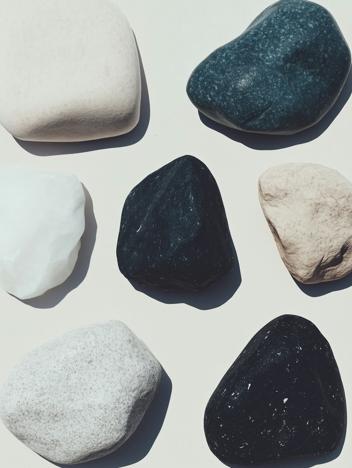 A minimalist arrangement of smooth stones in white, black, gray, and beige tones on a light surface, showcasing natural textures.