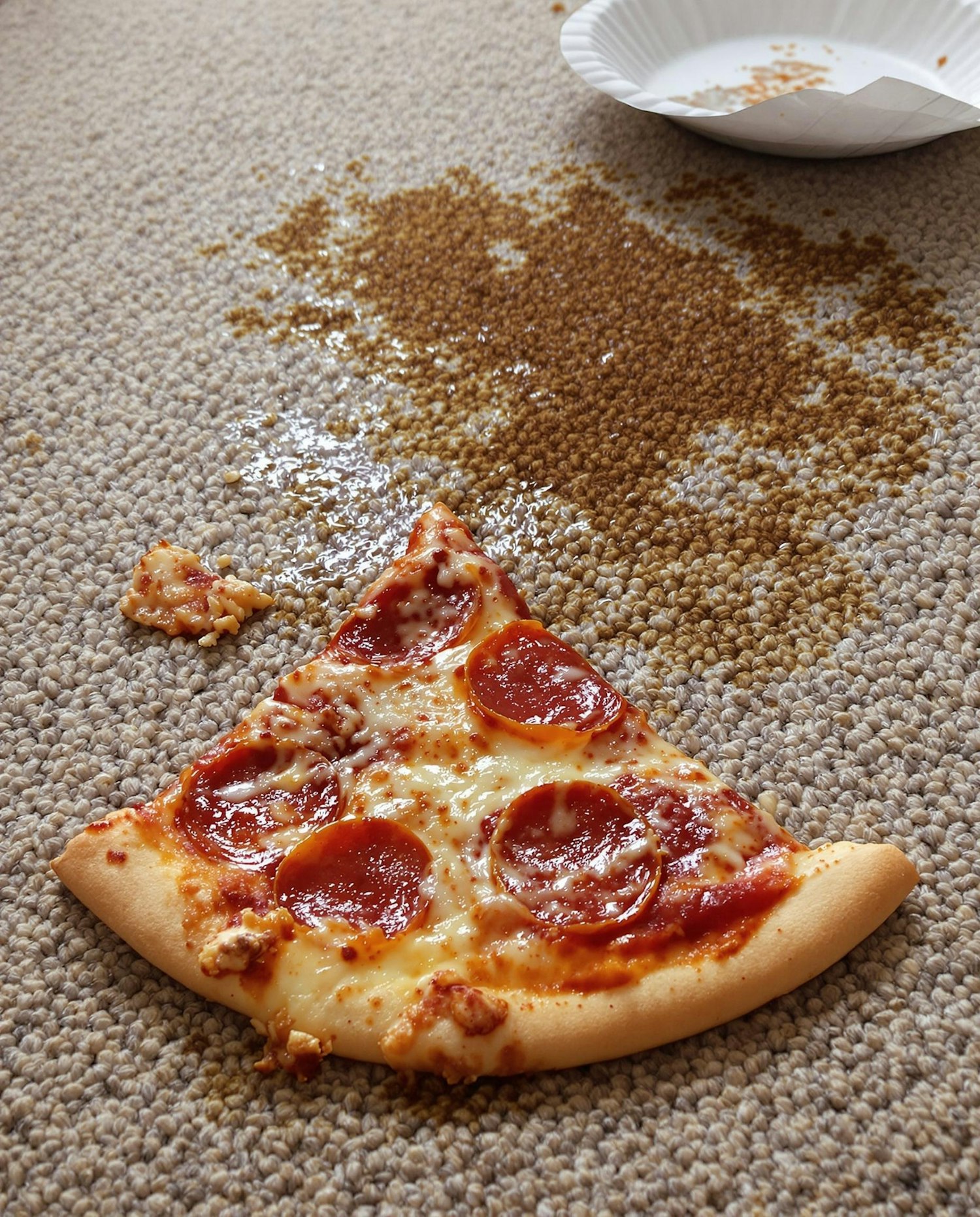 A slice of pepperoni pizza and spilled granules on a beige carpet, with a paper plate nearby suggesting an accidental mess.