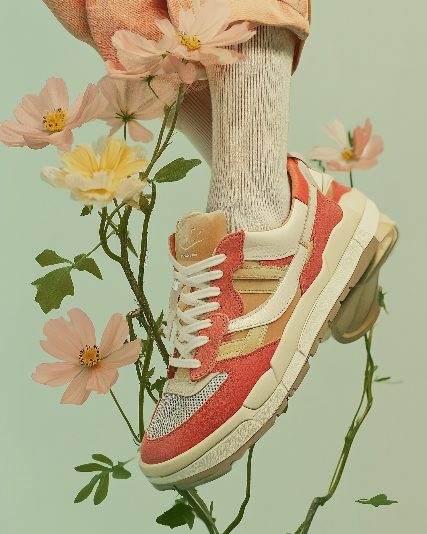 Stylish coral and beige sneakers paired with pastel pants, surrounded by delicate flowers on a mint green background.