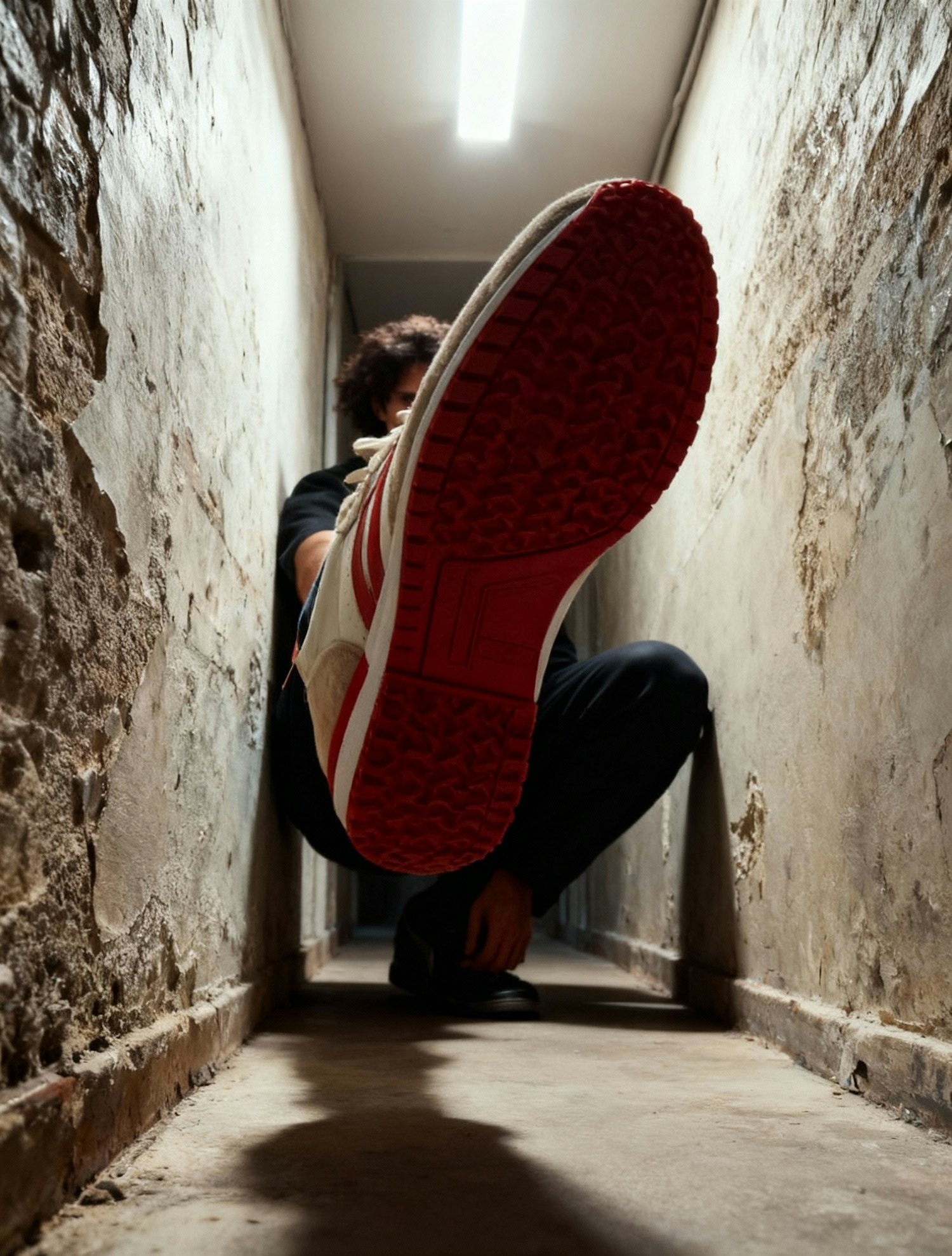 A close-up of a sneaker sole in a narrow corridor, with dramatic lighting highlighting the aged walls and the shoe's red and white design.