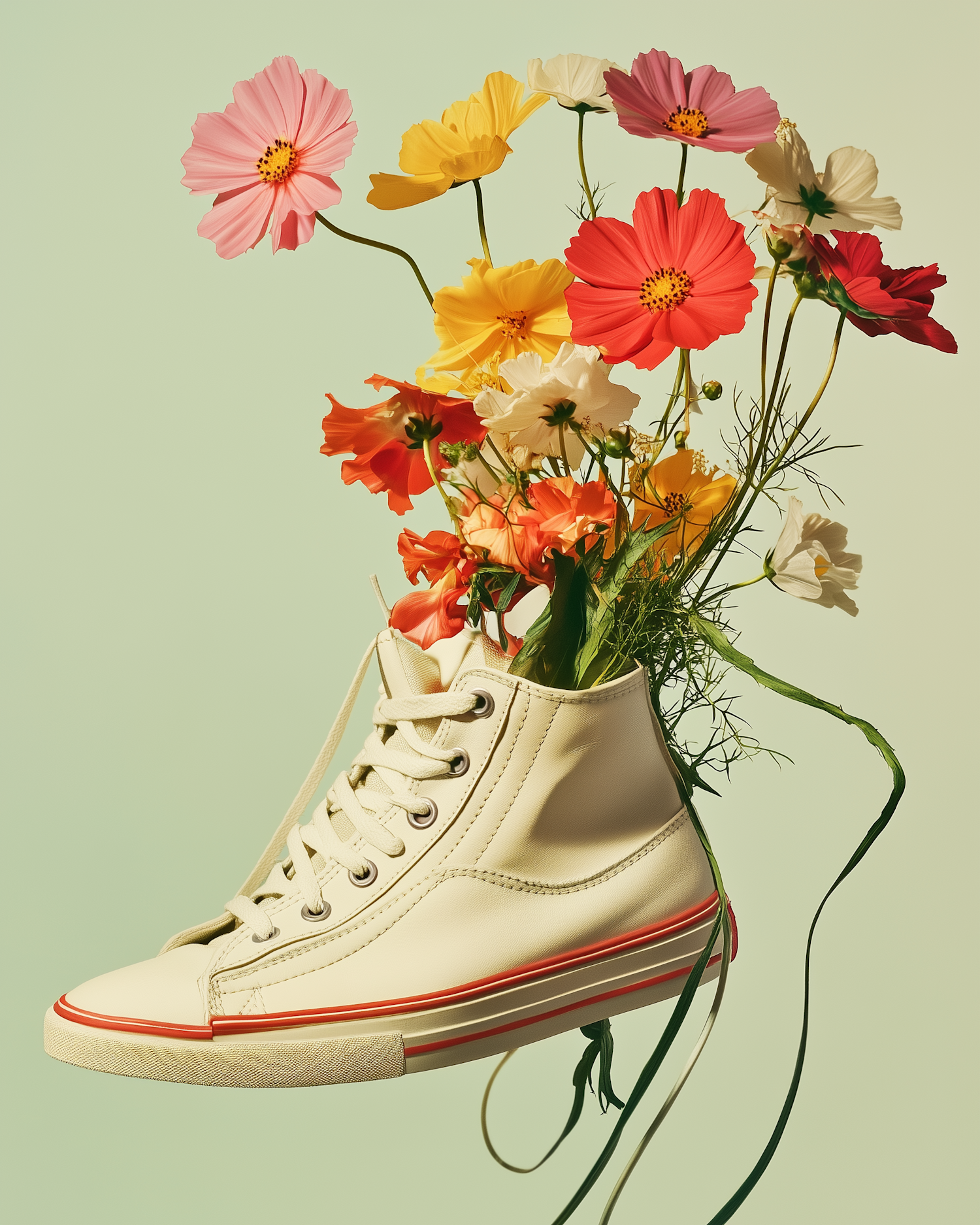 A white sneaker used as a vase with colorful flowers against a green background, blending fashion and nature creatively.