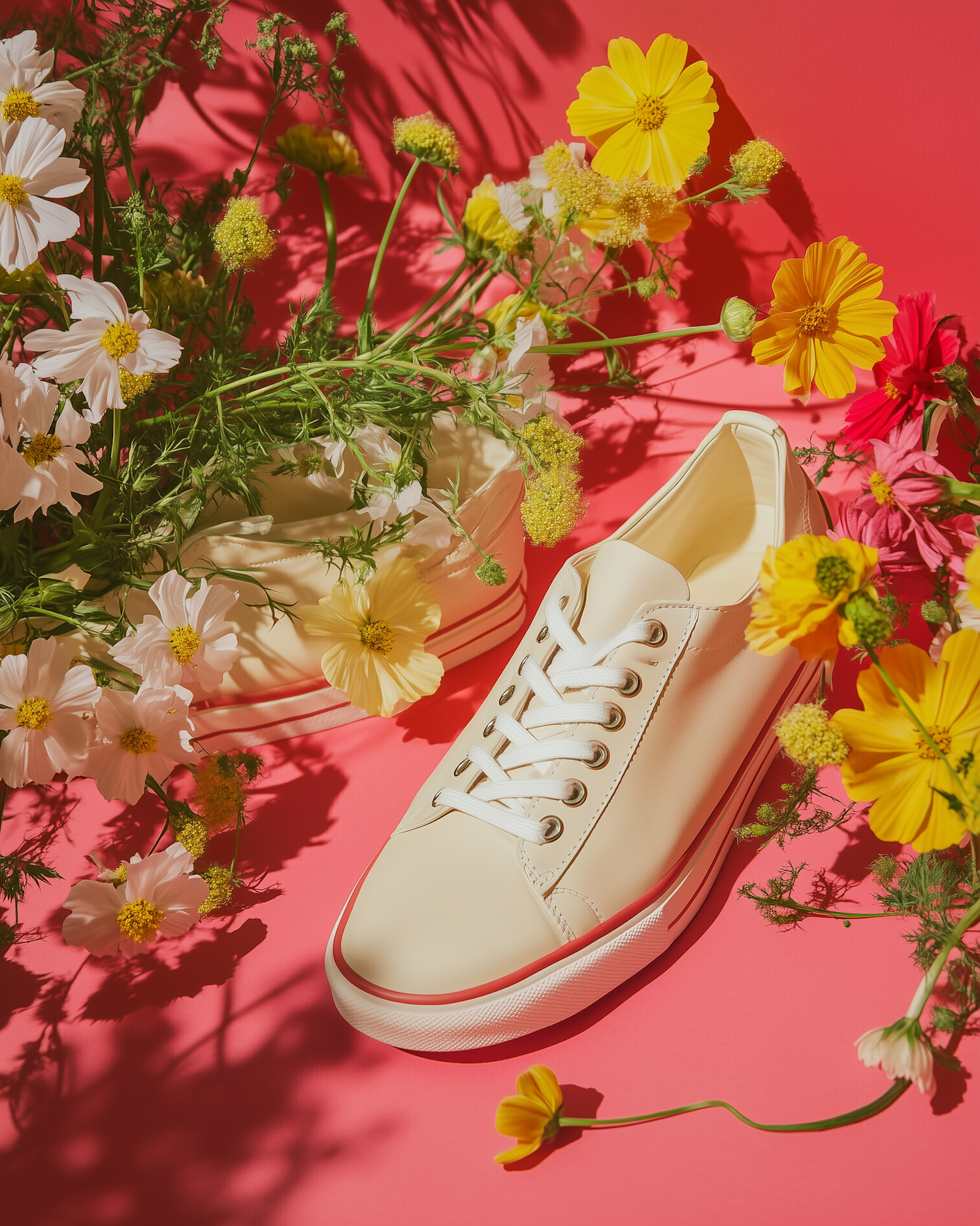White sneaker on a pink background surrounded by colorful flowers, creating a vibrant and fresh springtime vibe.