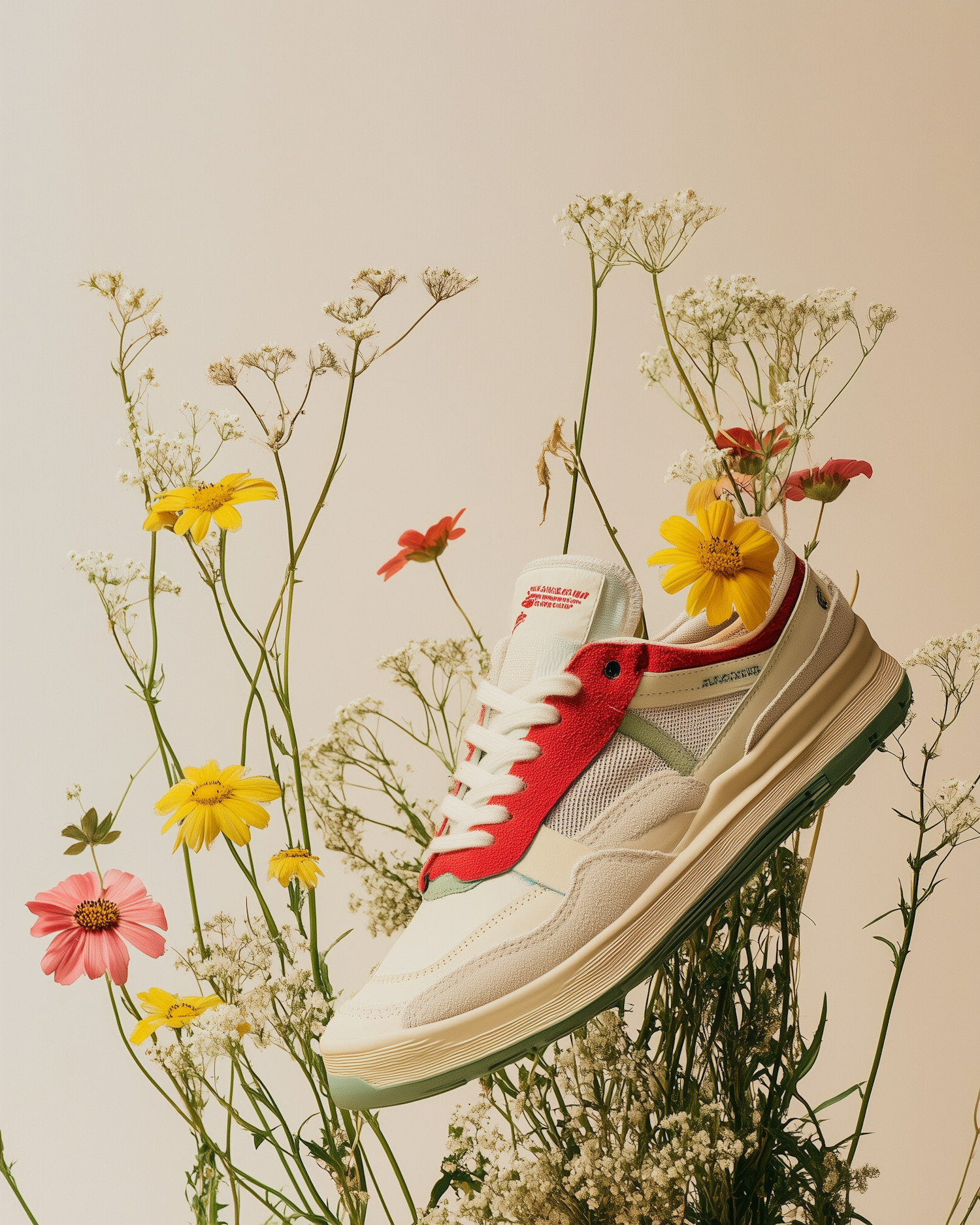 Stylish cream sneaker with red accents amidst vibrant wildflowers on a beige background, creating a fresh and dynamic composition.