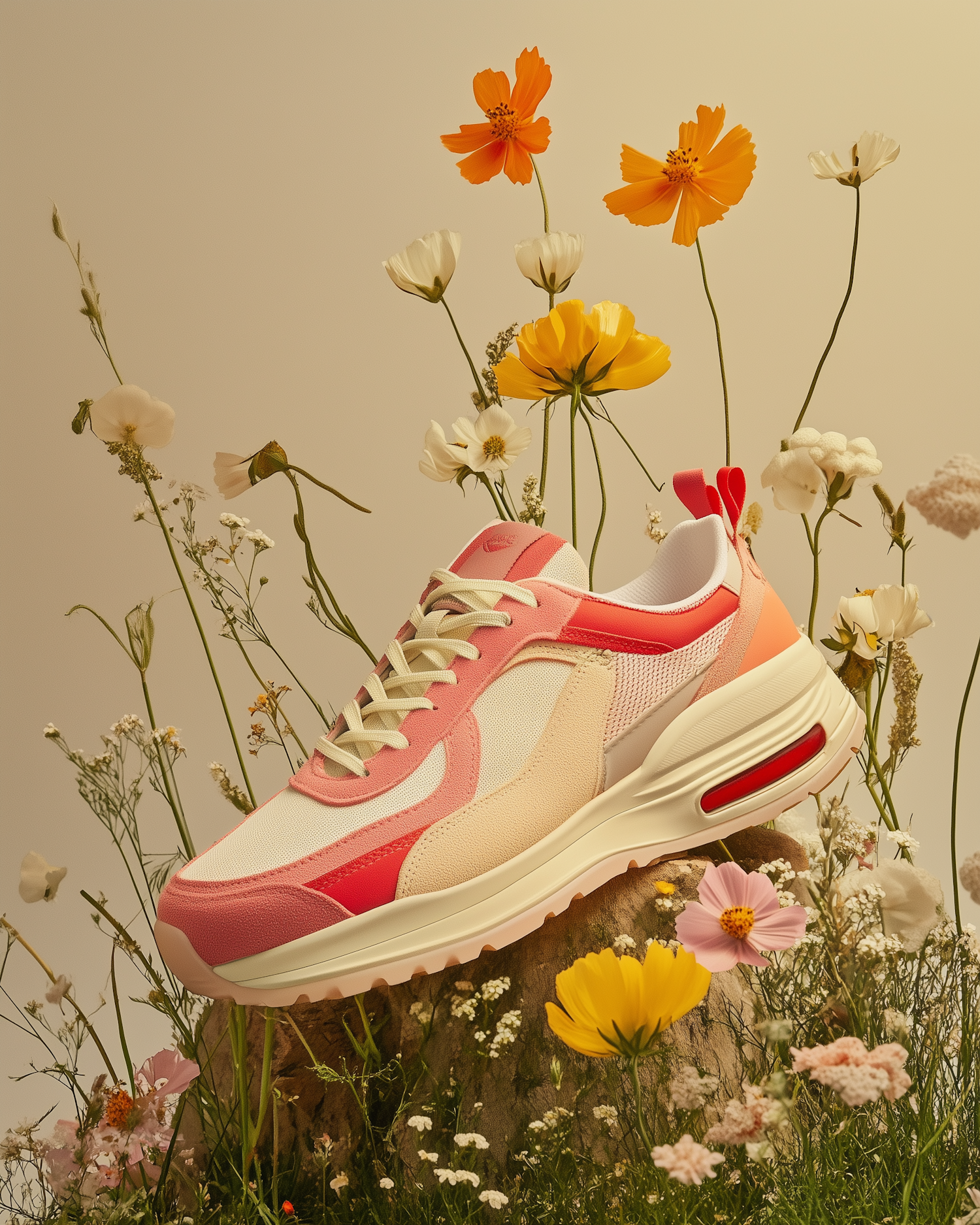 Stylish pink and cream sneaker surrounded by vibrant wildflowers, set against a soft, neutral background.