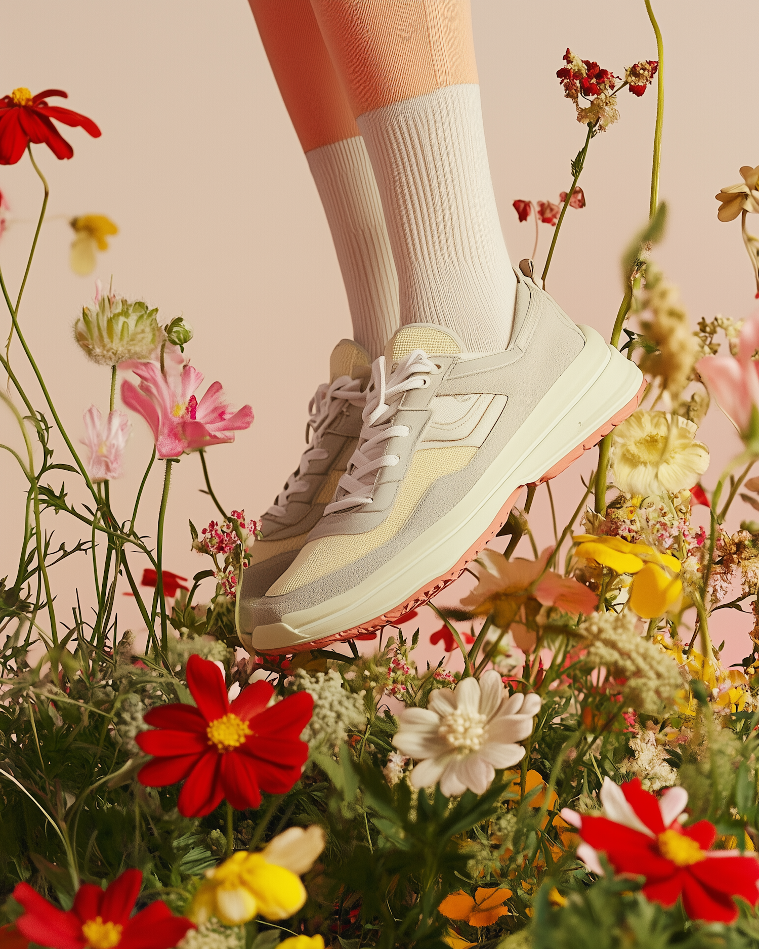 Stylish beige sneakers with white socks amidst vibrant red, yellow, and pink flowers, creating a fresh and lively scene.