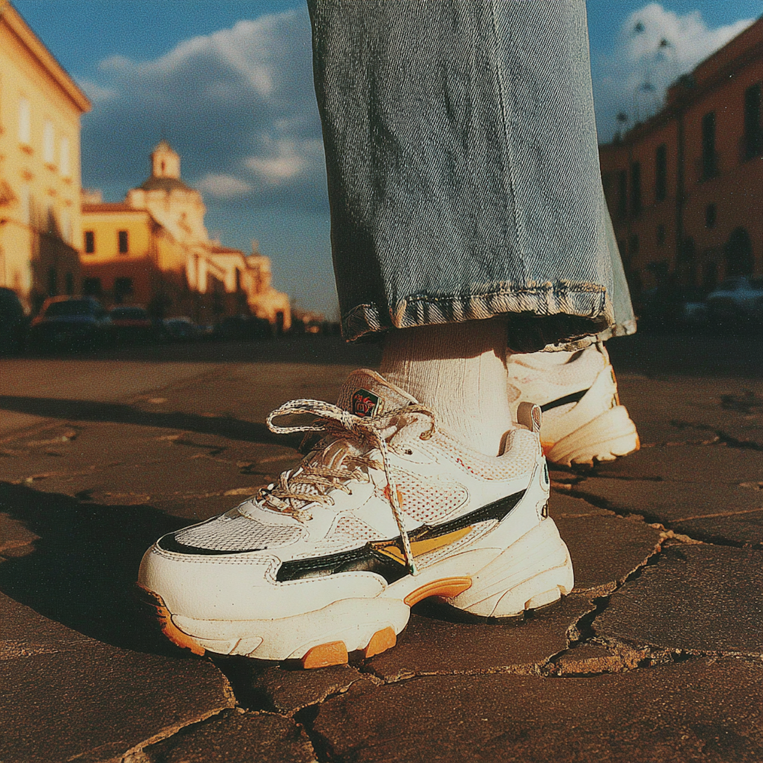 Stylish white sneakers with orange accents on a cobblestone street, paired with frayed denim jeans and warm sunlight in a historic town.