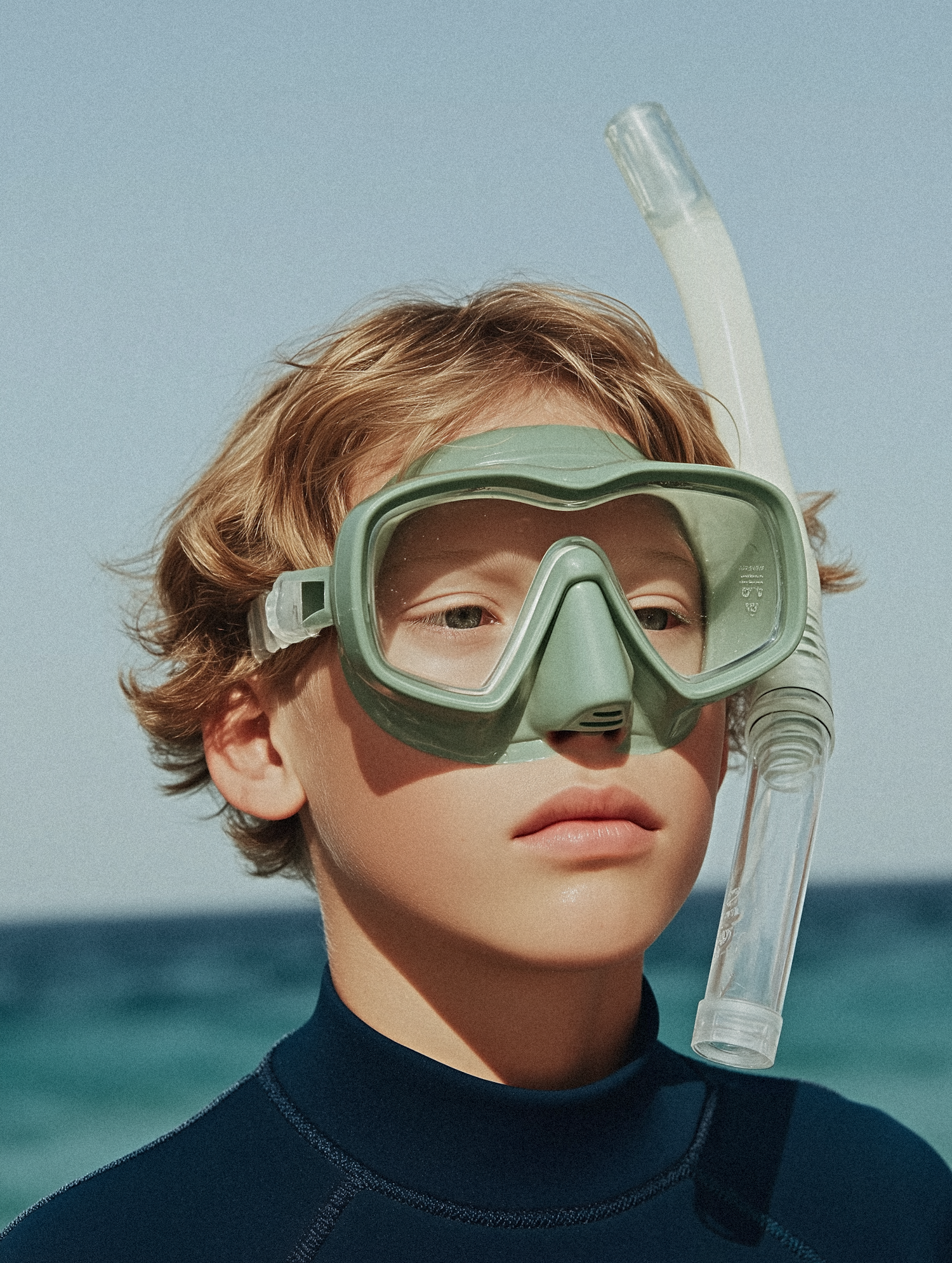 A young person wearing a green snorkel mask and wetsuit, standing by the ocean under a clear blue sky.